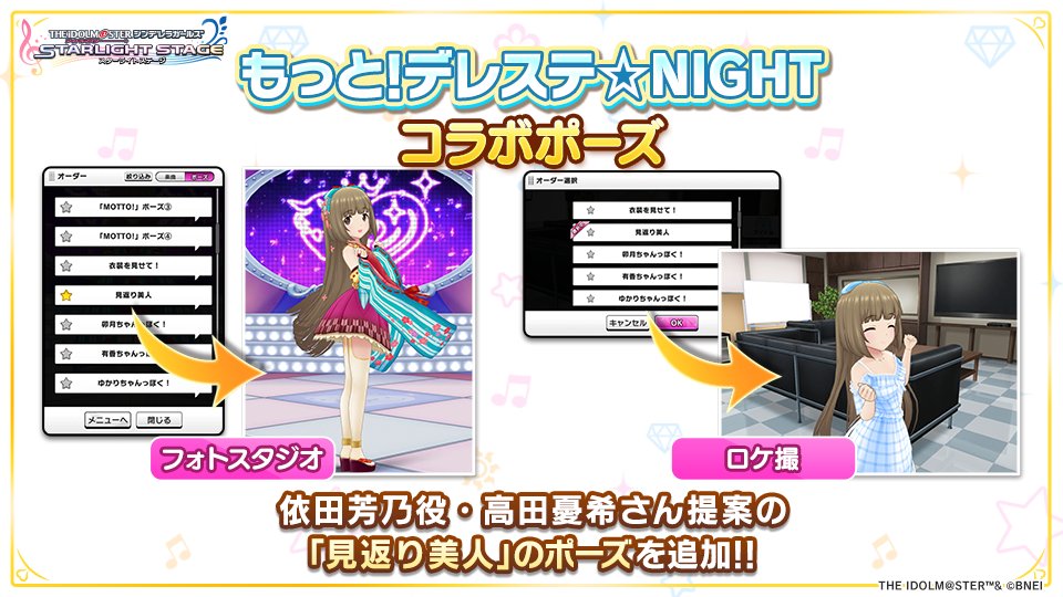 於「もっと!デレステ☆NIGHT」當中,飾演 依田芳乃 的聲優 高田憂希 所提案的姿勢「見返り美人」追加至遊戲,相片拍攝以及外景拍攝即可進行使用。
