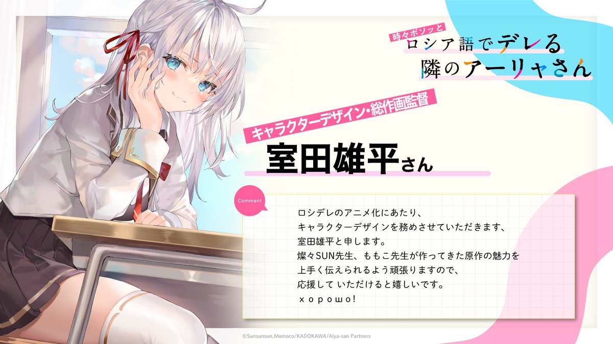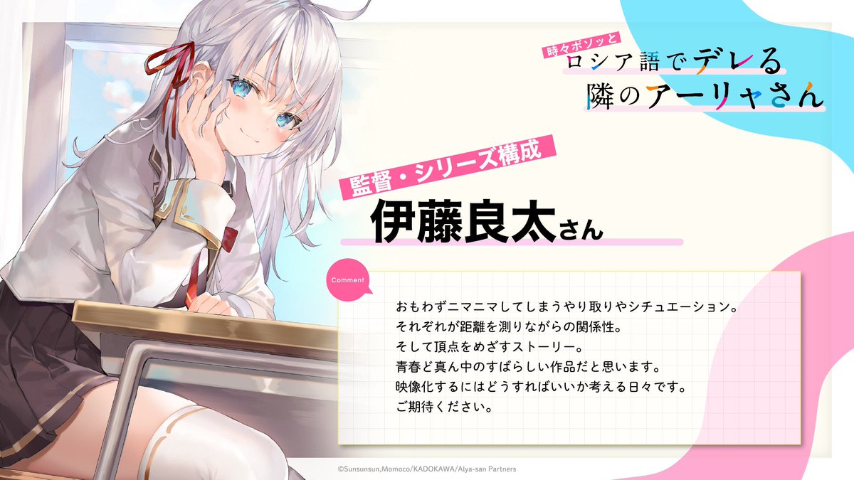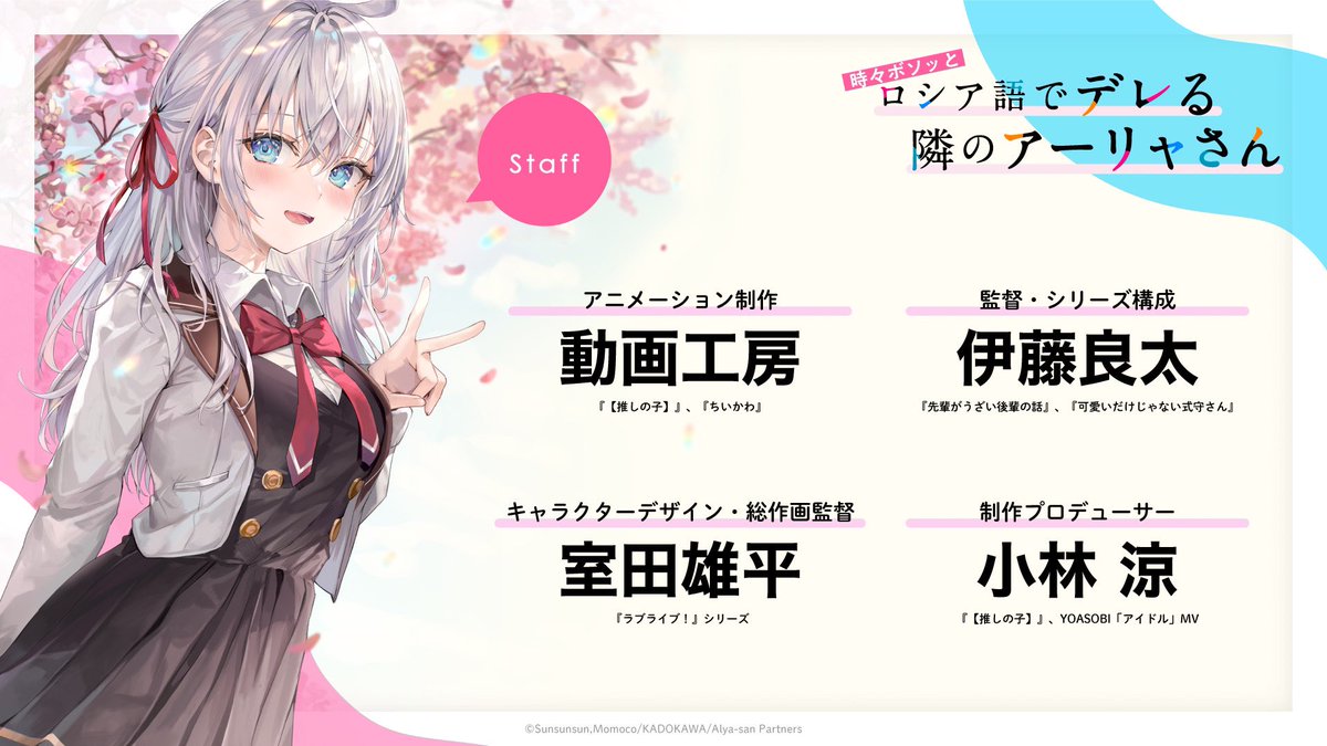 由 燦々SUN 所著、ももこ 負責插畫,於「角川 Sneaker 文庫(KADOKAWA)」出版的輕小說作品《不時輕聲地以俄語遮羞的鄰座艾莉同學》(台灣角川代理) ,早前發表電視動畫化的消息後(連結),官方在今(24)日釋出了首波概念視覺圖、主要製作團隊與追加聲優。