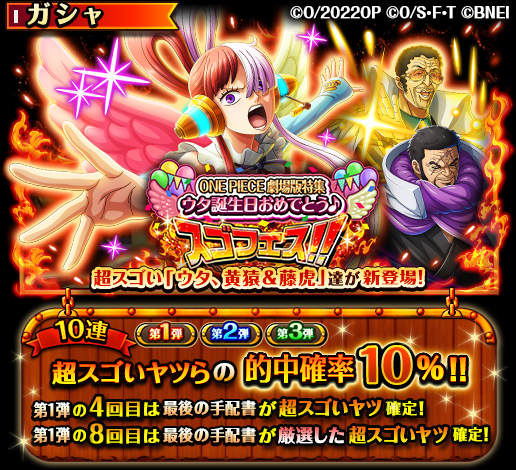 為紀念《航海王劇場版:紅髮歌姬》劇中角色「美音(ウタ;UTA)」於 10 月 1 日這天迎來生日,推出「ONE PIECE 劇場版特集 美音生日快樂 ♪ 超慶典 !!」轉蛋,限定角色【不屈服於逆光的決心】美音 以及【瞄準歌姬的大將們】黃猿&藤虎 登場,轉蛋實施三彈分別提升對應角色出現率,期間內至 11 月 11 日為止。