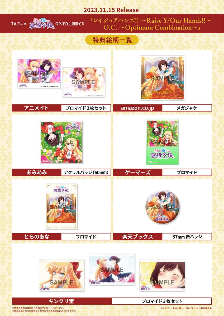 購入特典方面,購買 Blu-ray BOX 可獲得「克蕾雅 ver. 色紙&A3 塑膠海報」、購買 角色歌曲 CD(動畫《我的推是壞人大小姐。》OP/ED 主題曲)可獲得「零 ver.色紙」。
