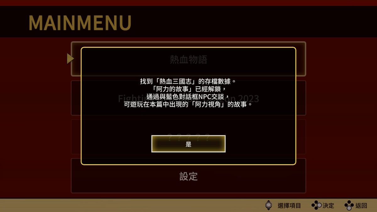 之前有熱血三國志的存檔就會解鎖【阿力的故事】