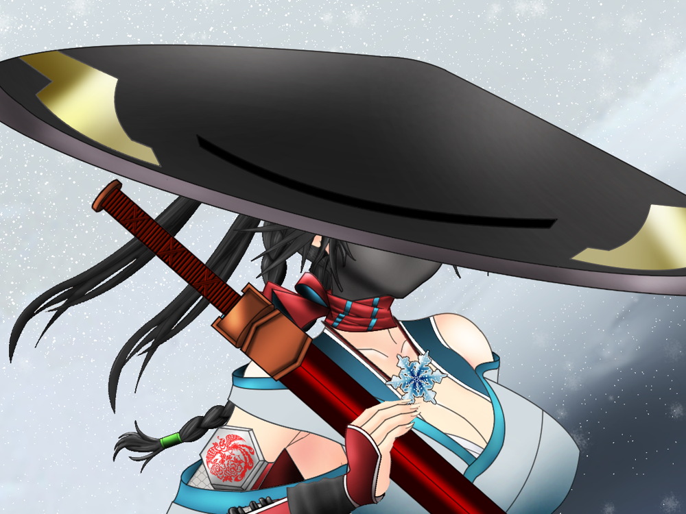 劍鞘半斜扛肩頭,隻身孤影立雪中。