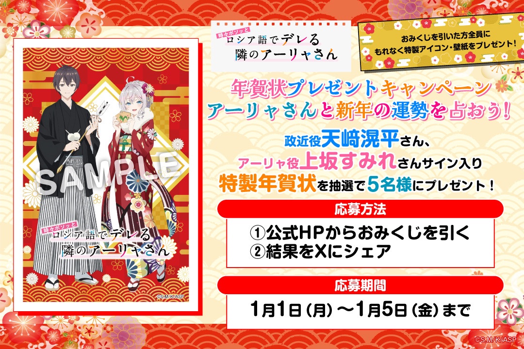 於官方網站 2024 正月新年特設網站 當中,進行運勢抽籤並分享結果至 X(推特)內,即可參與抽選 5 名幸運的粉絲獲得使用本視覺圖並含有兩位聲優親筆簽名的「賀年卡」,期間內至 1 月 5 日為止。