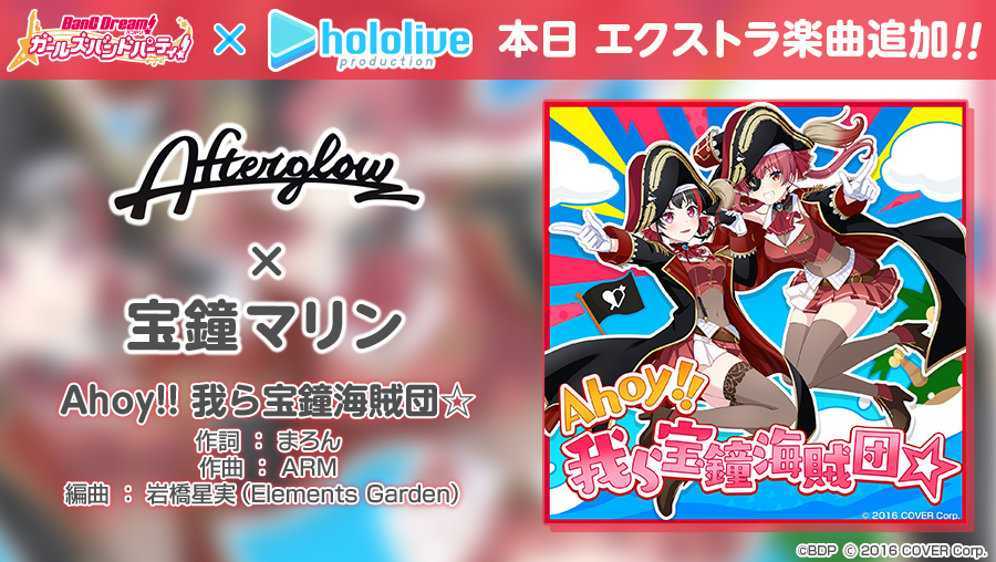 作為目前正在舉辦中的「hololive 合作第 2 彈 Part3」,公開由 Afterglow 與 寶鐘瑪琳 共同演唱的 EXTRA 歌曲『Ahoy!! 我ら宝鐘海賊団☆』音樂影片,本歌曲也自本日 13 日追加至遊戲當中。