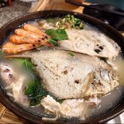 在風姿綽約的生魚片開場後接著是「鹽烤午仔魚」,秋入冬的午仔魚正對時,公斤級以上的"竹午"才有足夠的油度,身為學長的我"剛好"又被分到魚下巴......季節、體型和部位都對了,加上主廚恰到好處的火候,還能不好吃嗎?這時候最後一名骨科大叔已停好車抵達,請放心,在開刀房打滾過的男子漢都很能掌控吃飯的步調,不管落後幾道菜都很快就能趕上。