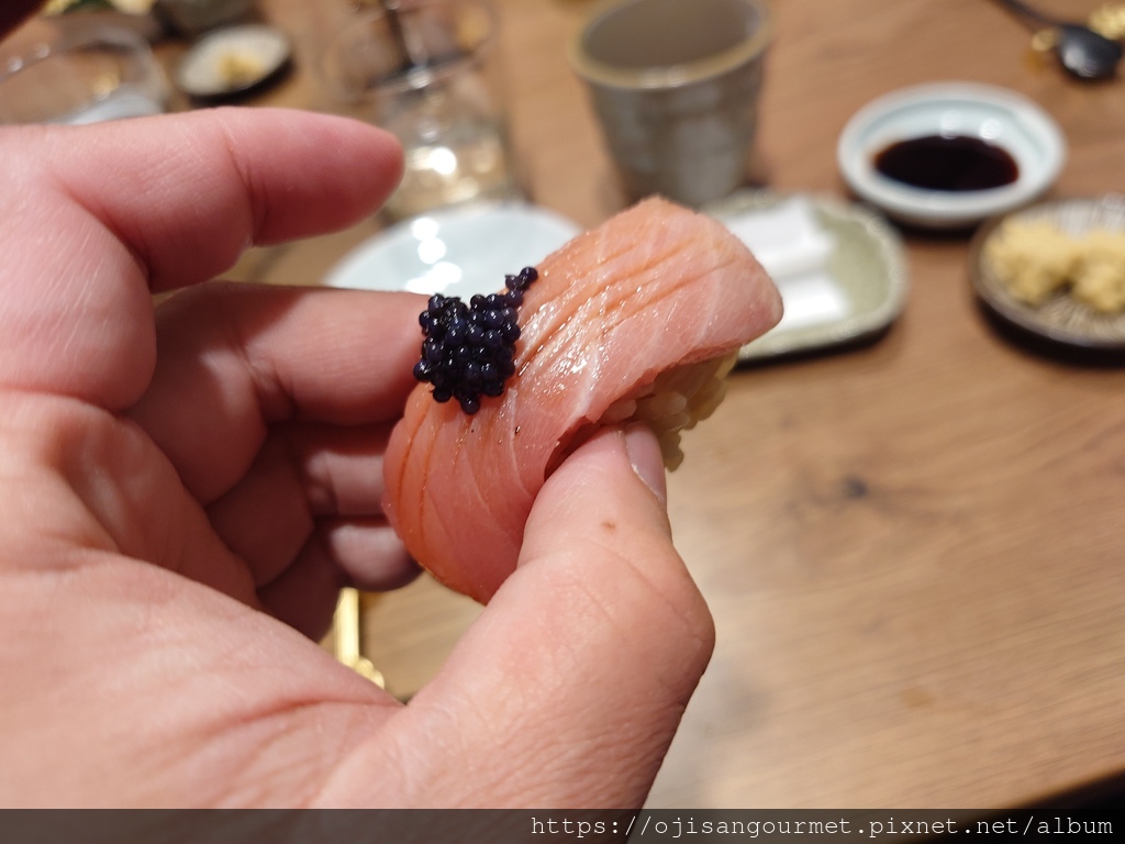 下一道生魚片「鮪魚中腹」上面也放了素魚子醬,適當的刀工斷筋讓柔軟的生魚片更入口即化,藻類特有的海潮香味讓熟成後的鮪魚中腹甜度凸顯鮮明。當然有些食客會再加價升級為大腹,但是對我們而言油度增一分太過,這樣恰到好處。
