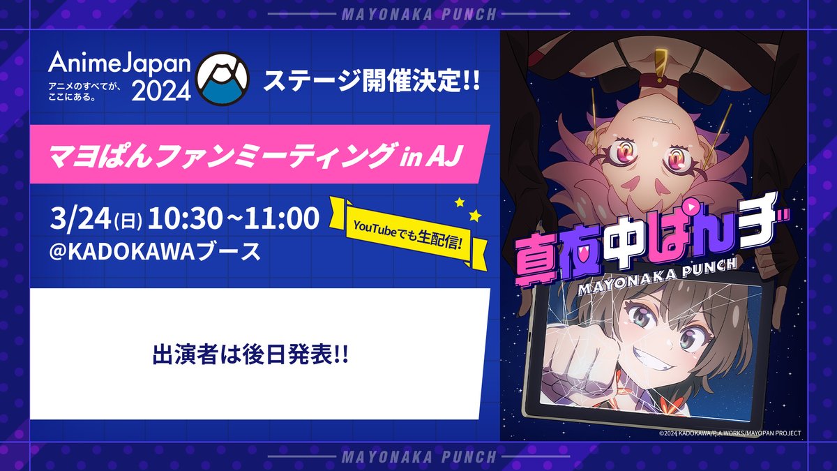 預定在 3 月 24 日日本時間 10:30~11:00 於日本 AnimeJapan2024 角川攤位,將實施原創動畫《深夜中的一擊》特別舞台,當中將會有豪華聲優陣容出席並於日後公開出演者名單。