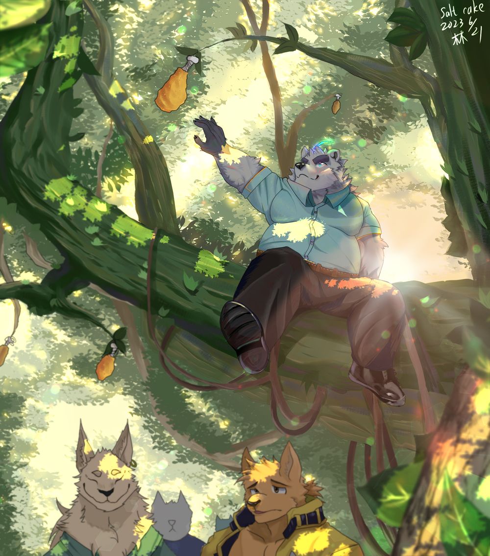 坐在樹上的保羅 下面是 落水狗的角色