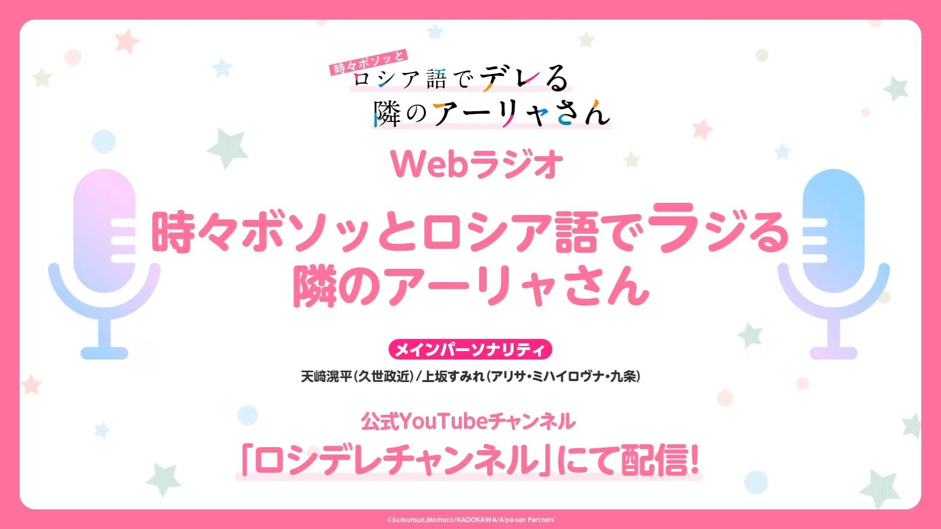 預定於動畫《不時輕聲地以俄語遮羞的鄰座艾莉同學》官方 YouTube 頻道,將實施 WEB 廣播節目,分別由飾演 久世政近 的 天﨑滉平 以及飾演 艾莉莎·米哈伊羅夫納·九條(艾莉)的 上坂堇 擔任節目主持人。