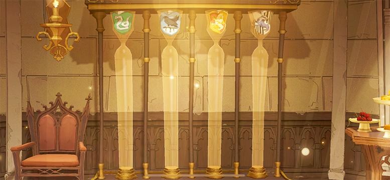 眾赫夫帕夫視線齊看向「學院分沙漏」,現在每個學院都還未裝滿寶石,但可以想像赫夫帕夫沙漏裝滿黃鑽的美景,遠遠高於其他三院。