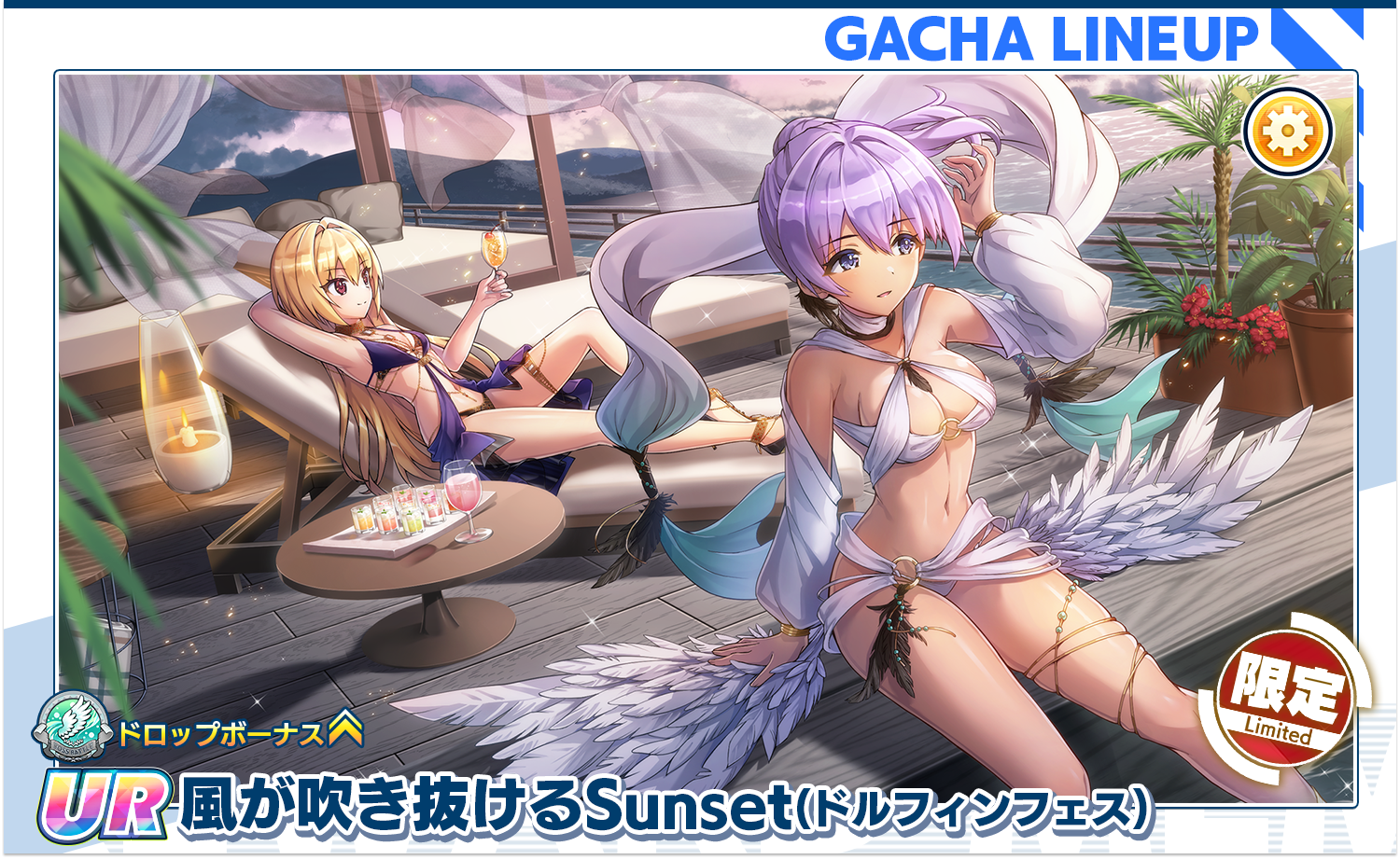 本次PU的新海豚為 UR 相馬颯(風之精靈/海豚祭) 相馬颯(シルフィード/ドルフィンフェス) 以及 UR 風見艾蓮(位高任重/海豚祭) 風見エレン(ノブレスオブリージュ/ドルフィンフェス) 。※本卡池新衣裝為期間限定