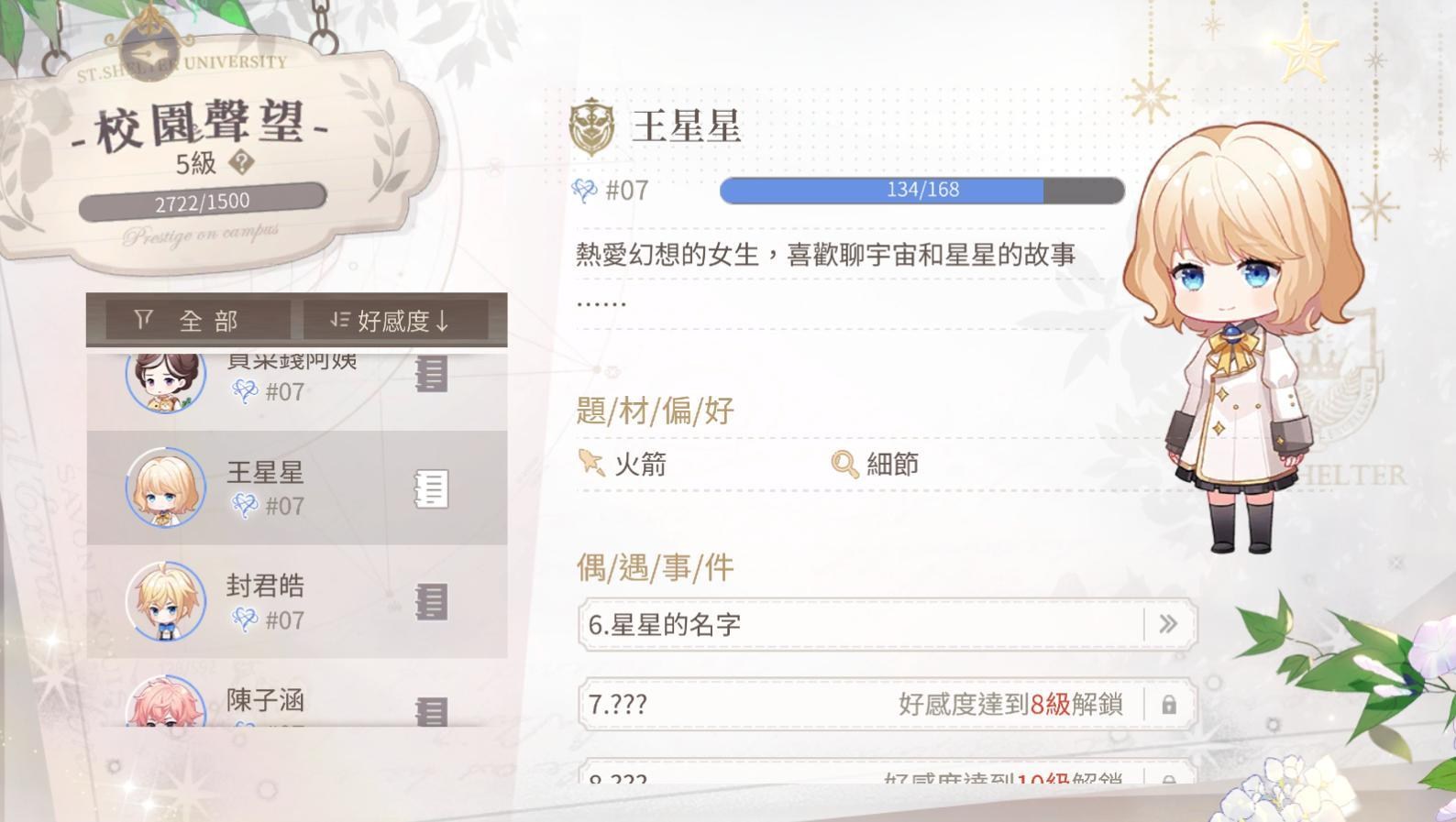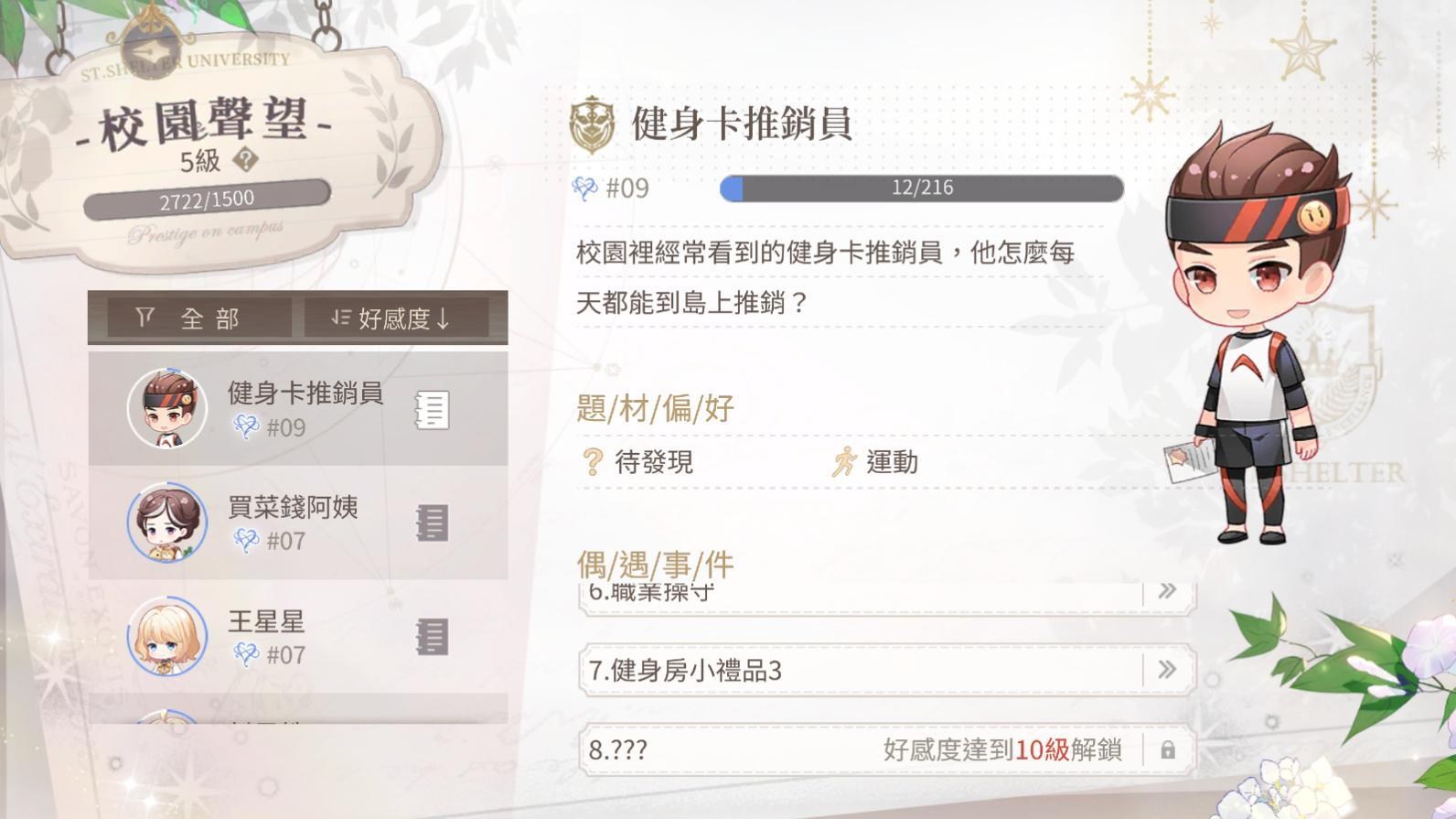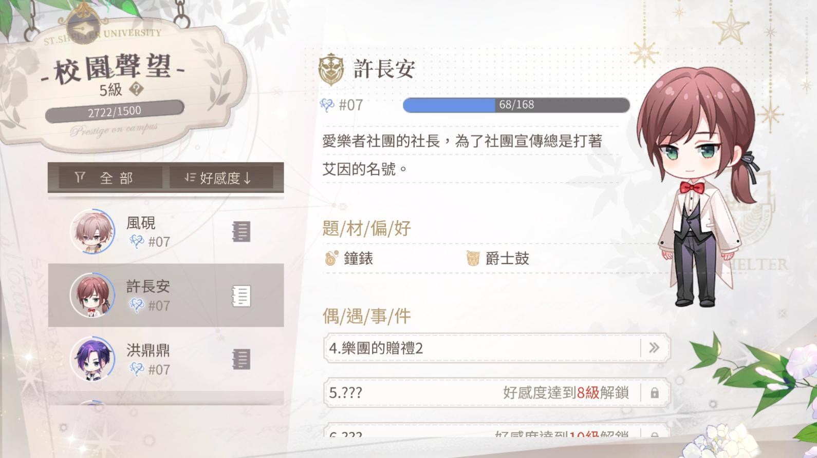 每個男主都有自己喜歡的禮物,針對送的話自然加的好感度會比較多,提升男主好感度會有好感度劇情可看,劇情或電話會放置在主畫面>筆記內