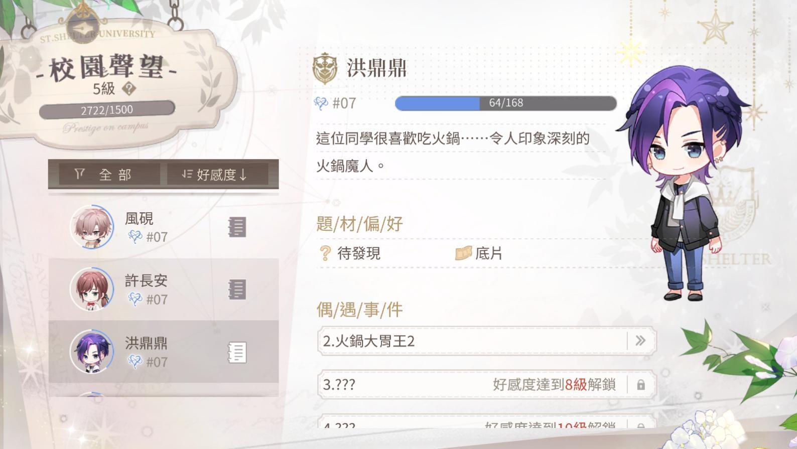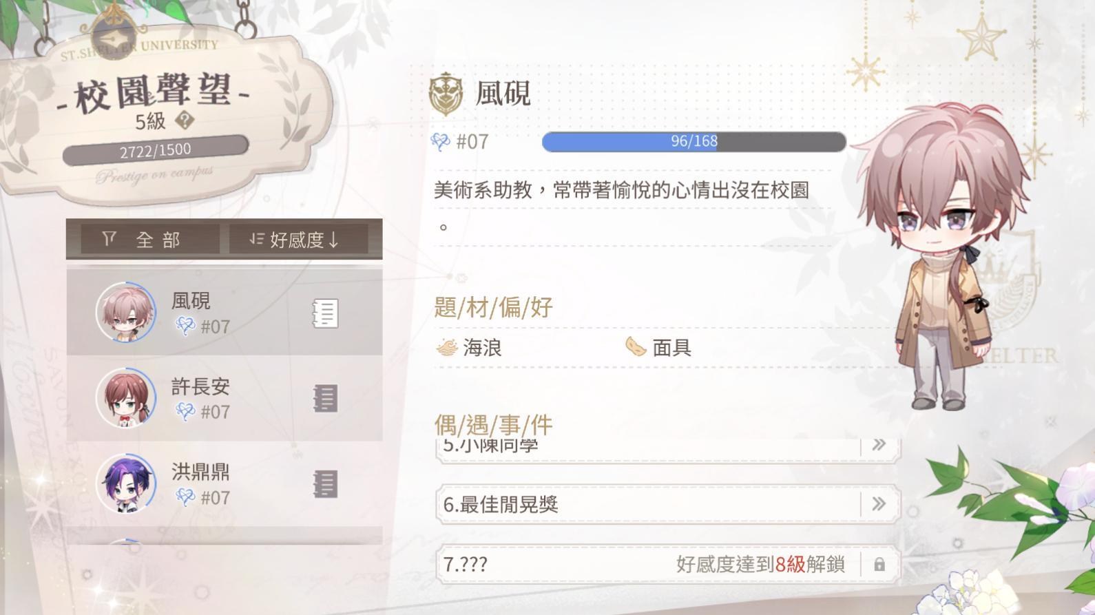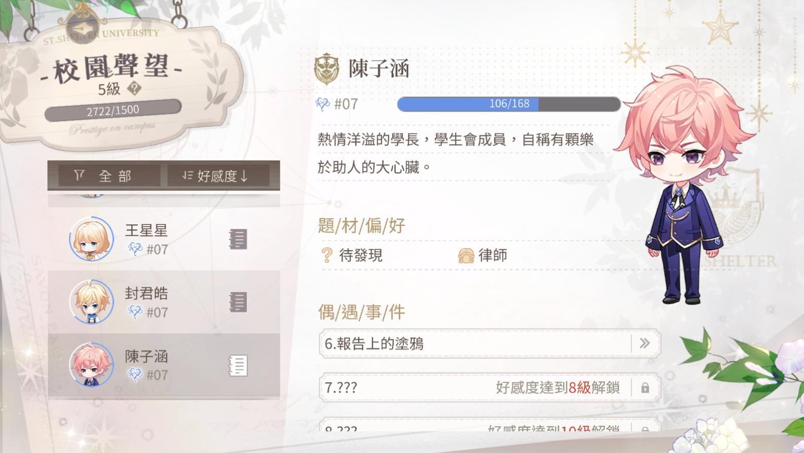 每個男主都有自己喜歡的禮物,針對送的話自然加的好感度會比較多,提升男主好感度會有好感度劇情可看,劇情或電話會放置在主畫面>筆記內