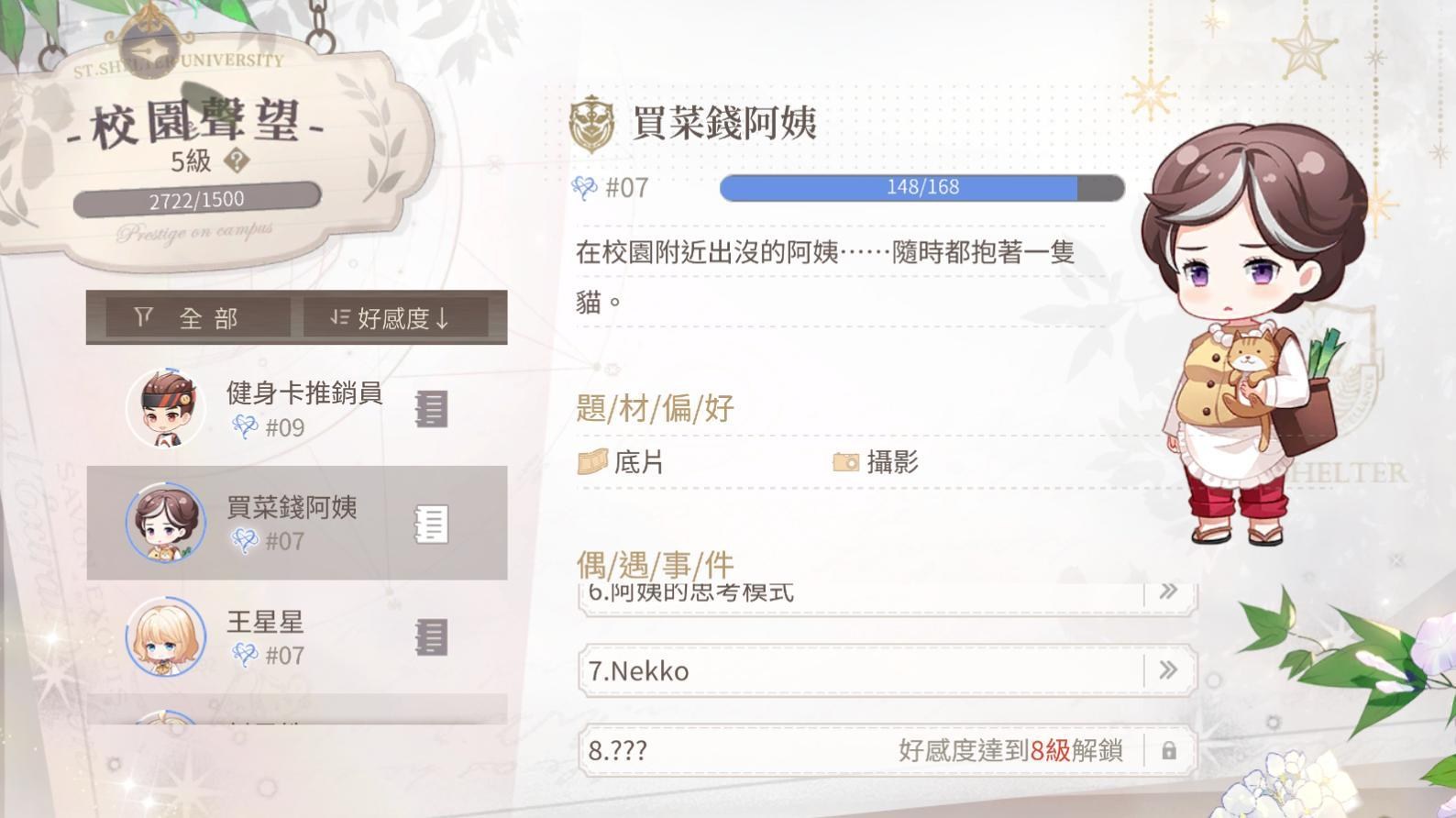 建議加NPC的好感度,不要選男主,因為男主可以送禮加好感,但NPC只有行程或速寫才能加,且有些NPC加好感後會送抽卡主要道具「老荷蘭顏料」,所以請先升以下NPC的好感: