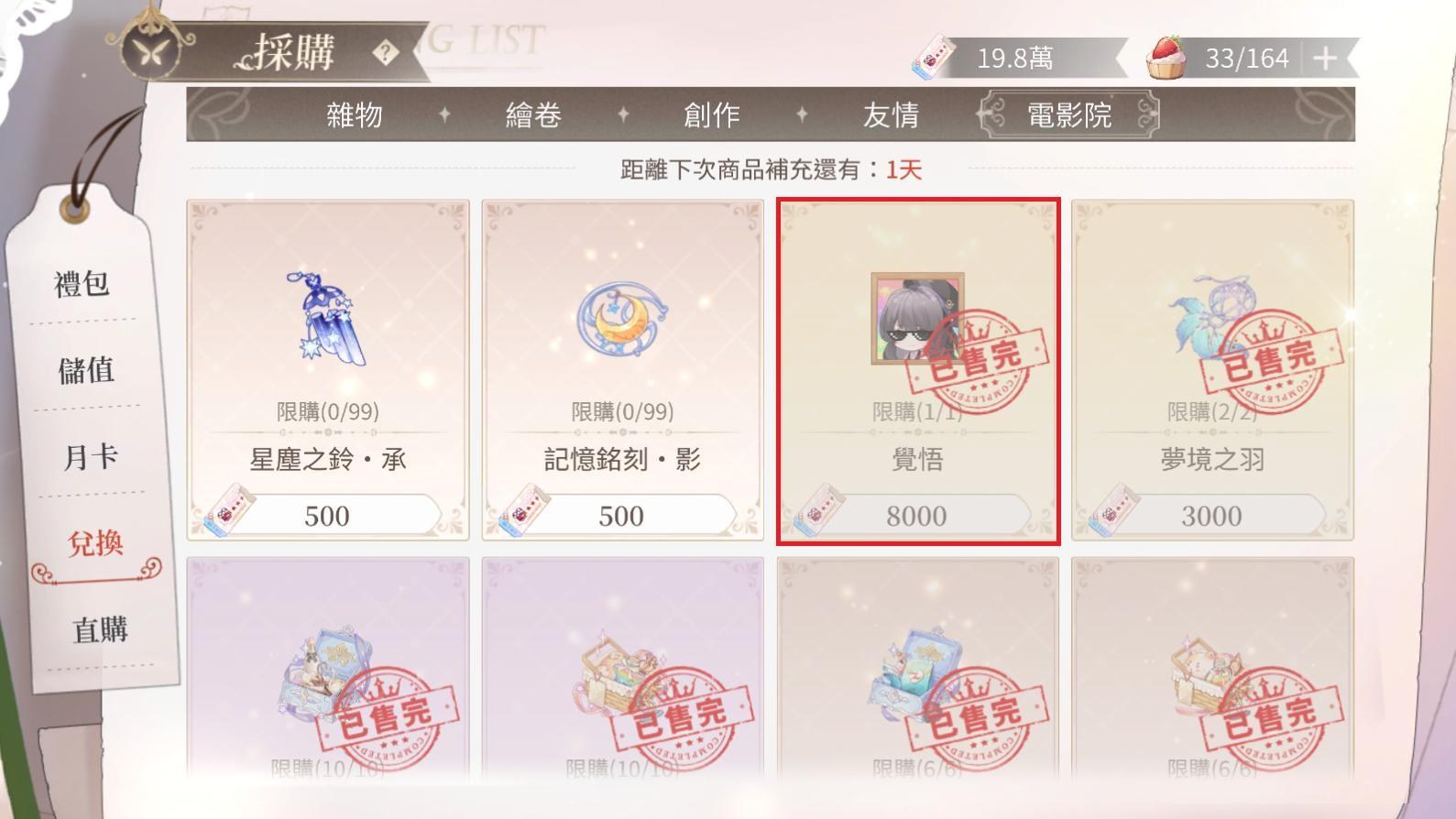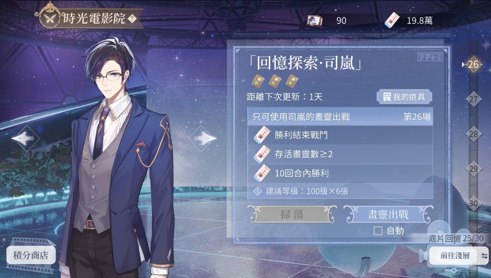 時光電影院是高難本,限定在該男主的電影院只能使用該男主的畫靈出戰,單推主攻自己推的電影院即可,主要是過關蒐集「電影票」,而後至採購>兌換>電影院獲取覺悟
