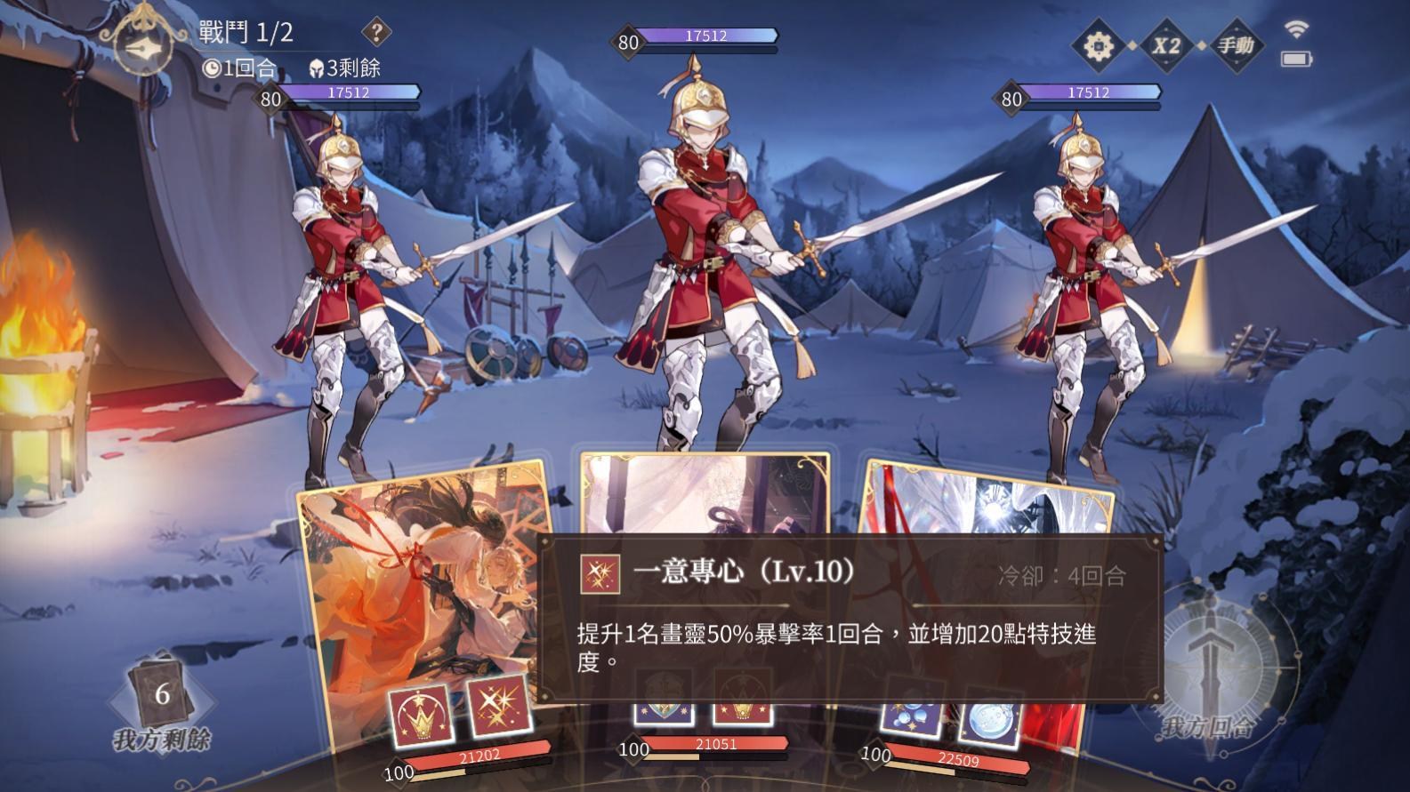 - 先點按特技的話會發現所有小技能無法點選使用,但只要所有卡都指定好攻擊對象,小技能又會恢復可使用狀態