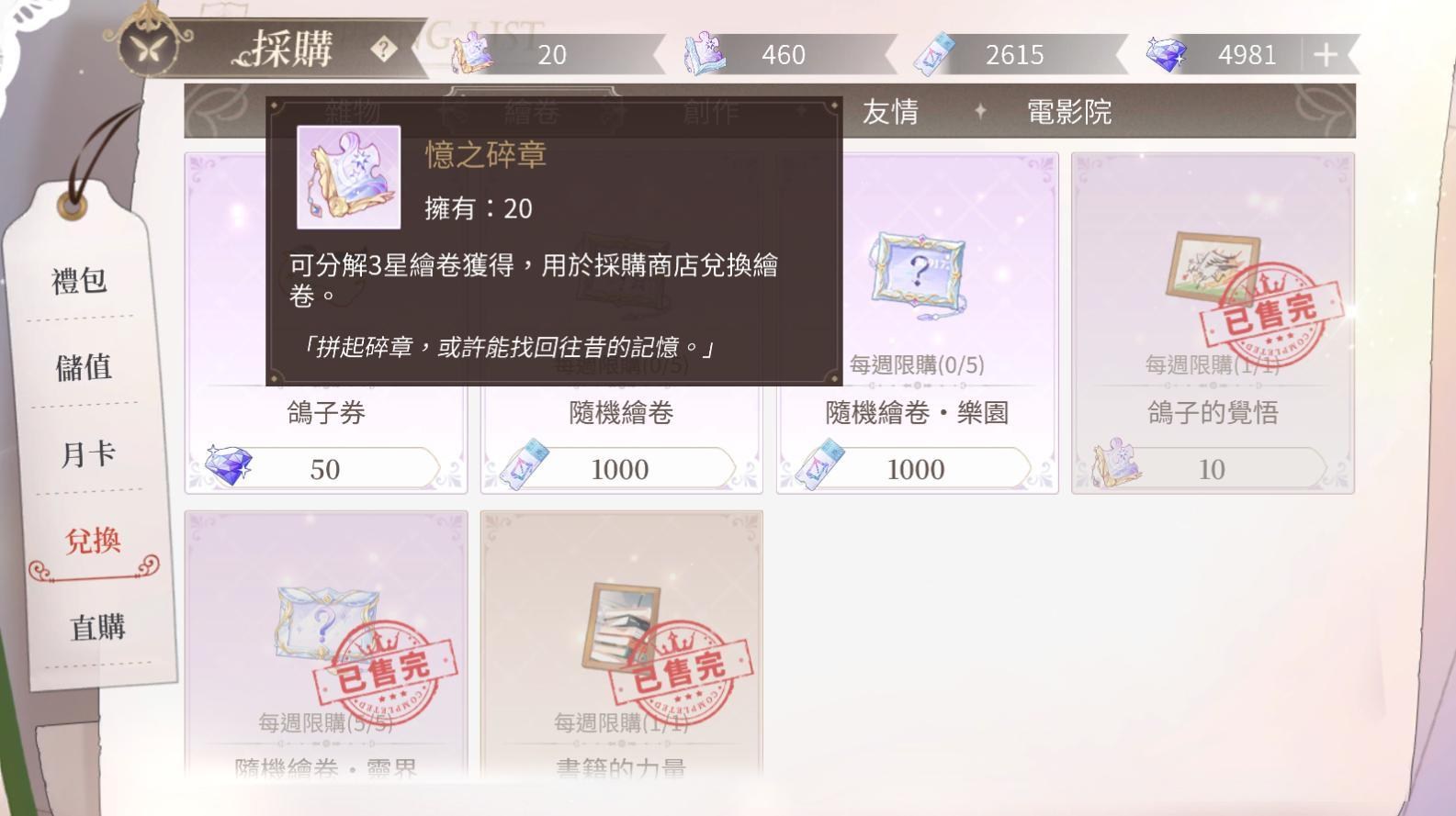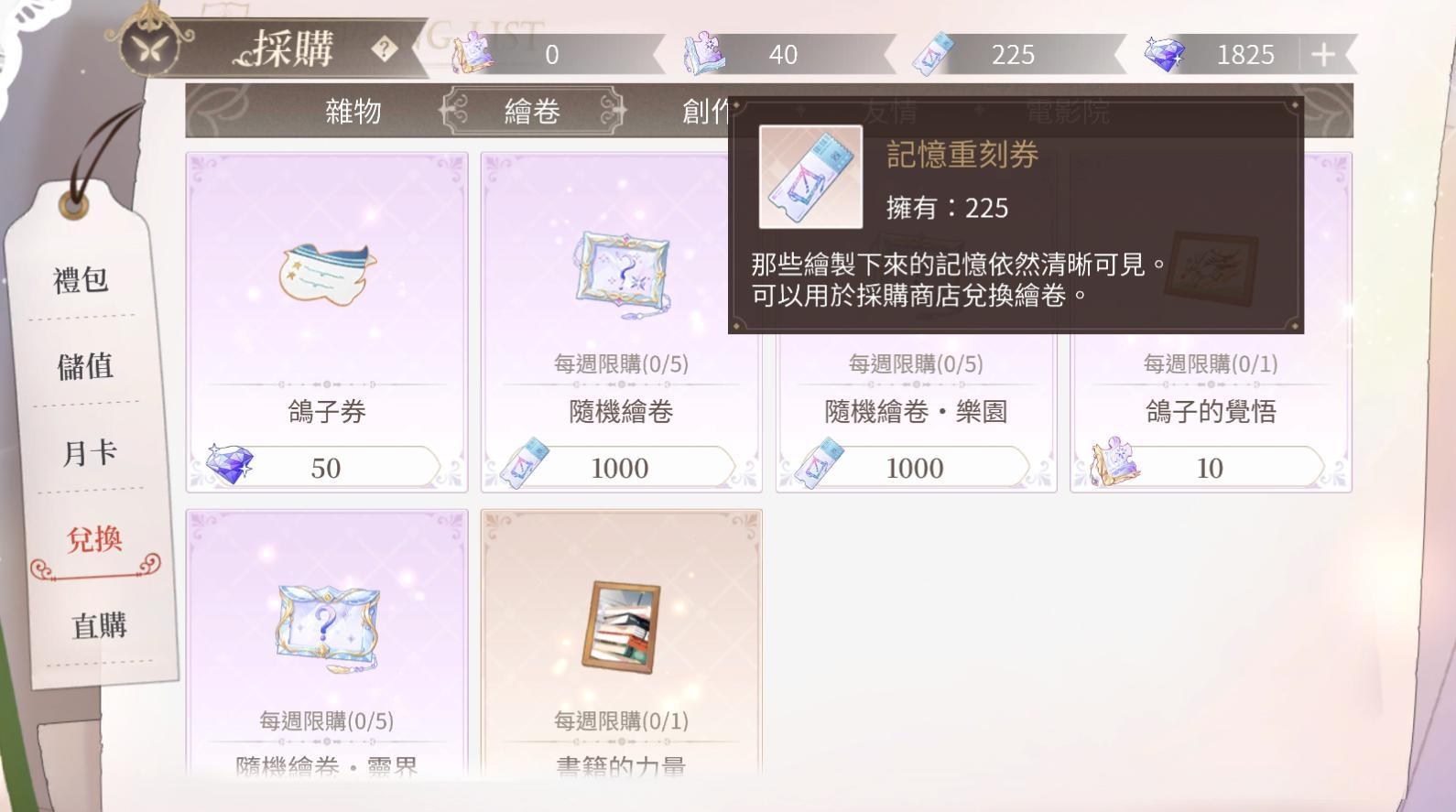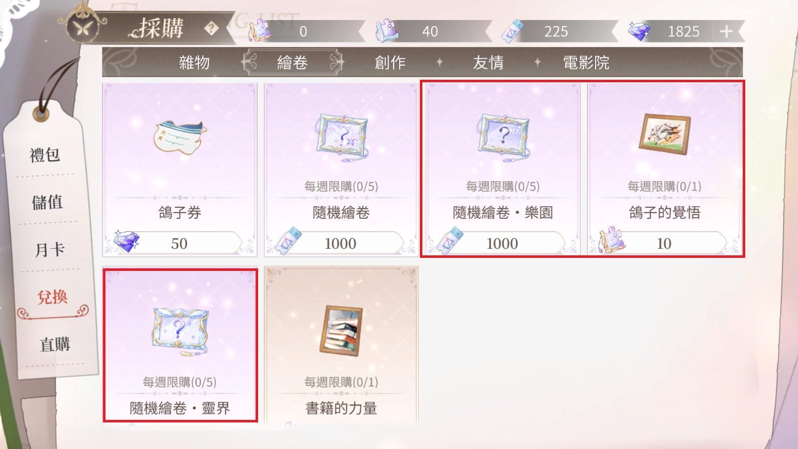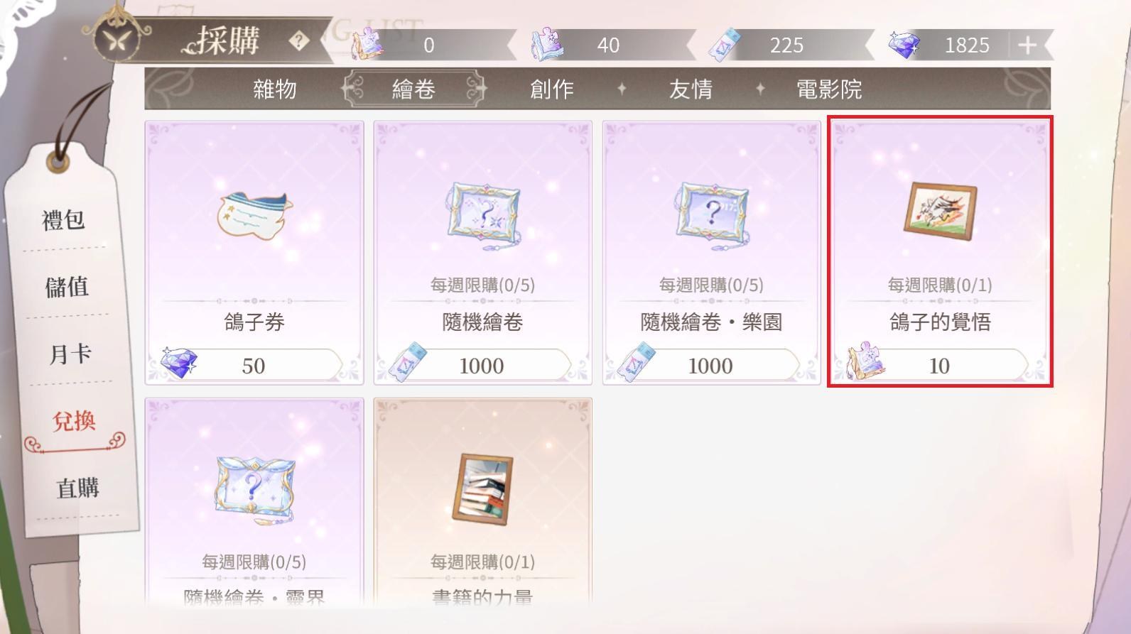 之後每個禮拜可以到採購>兌換>繪卷,兌換道具「鴿子的覺悟」