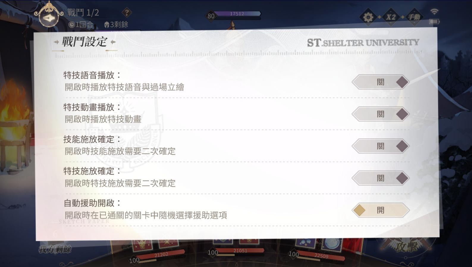 - 右上角可以切自動或手動,手動戰鬥時右上角設定內,可以關閉特技語音、特技動畫、二次確定技能施放、二次確定特技施放、開啟自動援助(自動無法點開設定)