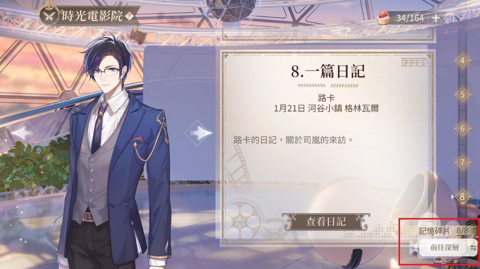 不過新手必須要過到第三個主線──現代篇,才會有時光電影院可以打,而且時光電影院還得先在淺層集滿8個記憶碎片才可以前往深層