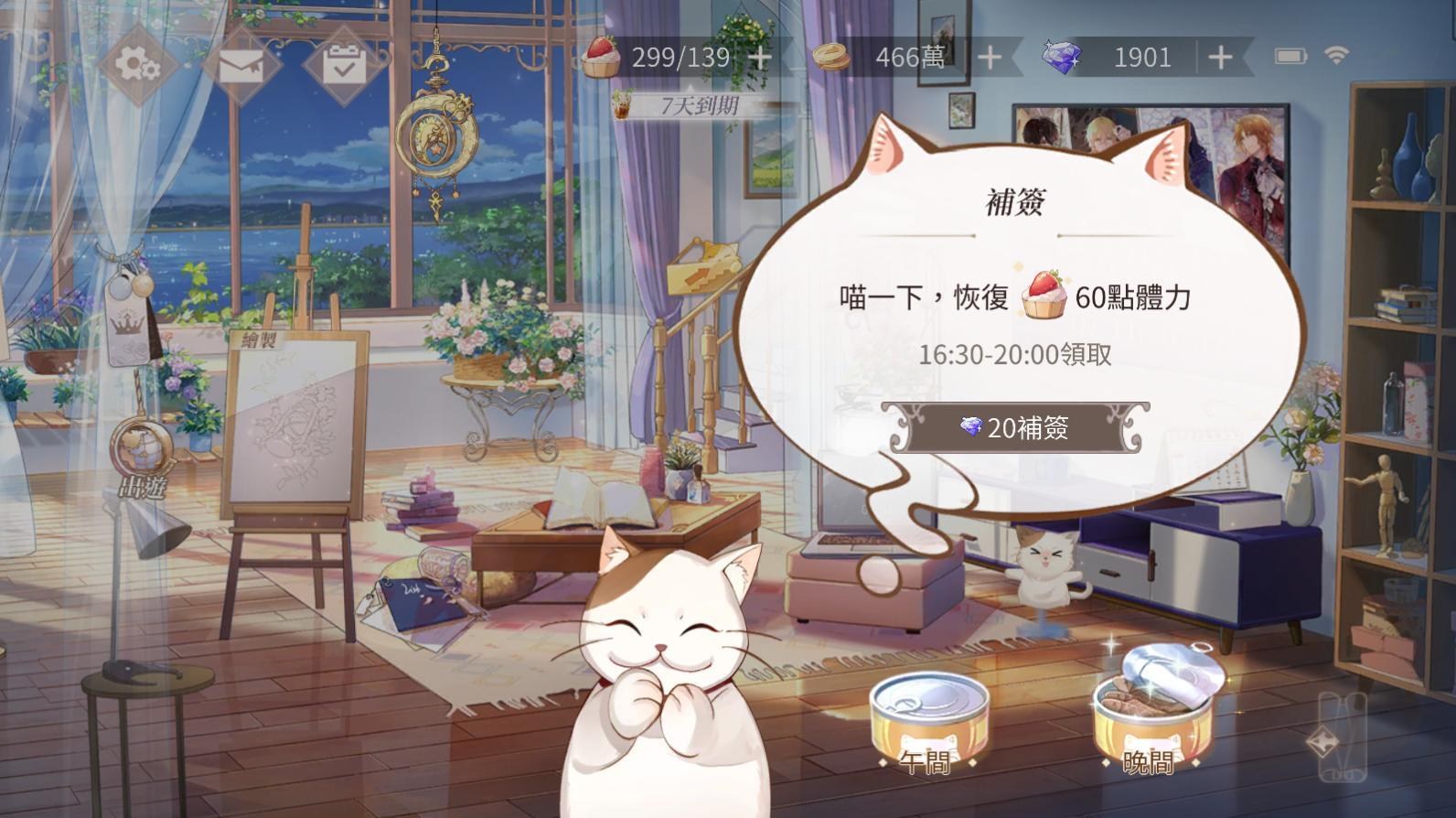 體力非常珍貴,建議不要錯過,如果真的錯過,點擊主畫面貓貓可以使用鑽石購買今天錯過的體力,但其實不太建議這樣做,因為鑽石算是比較寶貴的抽卡物資,尤其無課千萬別花鑽在購買體力上面