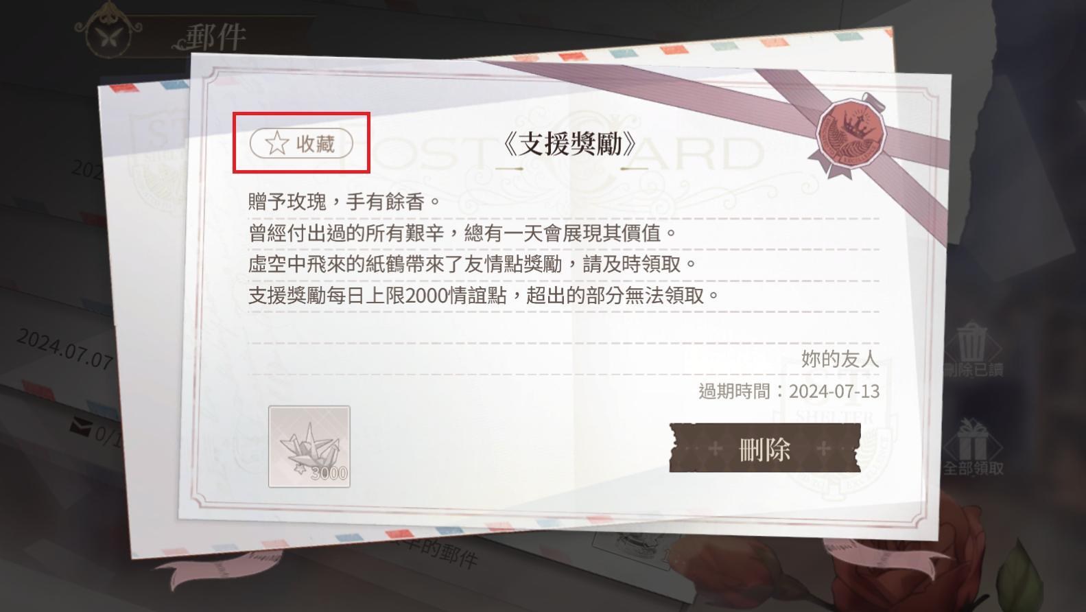 主畫面左上角郵件點開,為了防止誤刪郵件或被定期清理掉,可以按下信件內容左上角的收藏,避免郵件被刪除