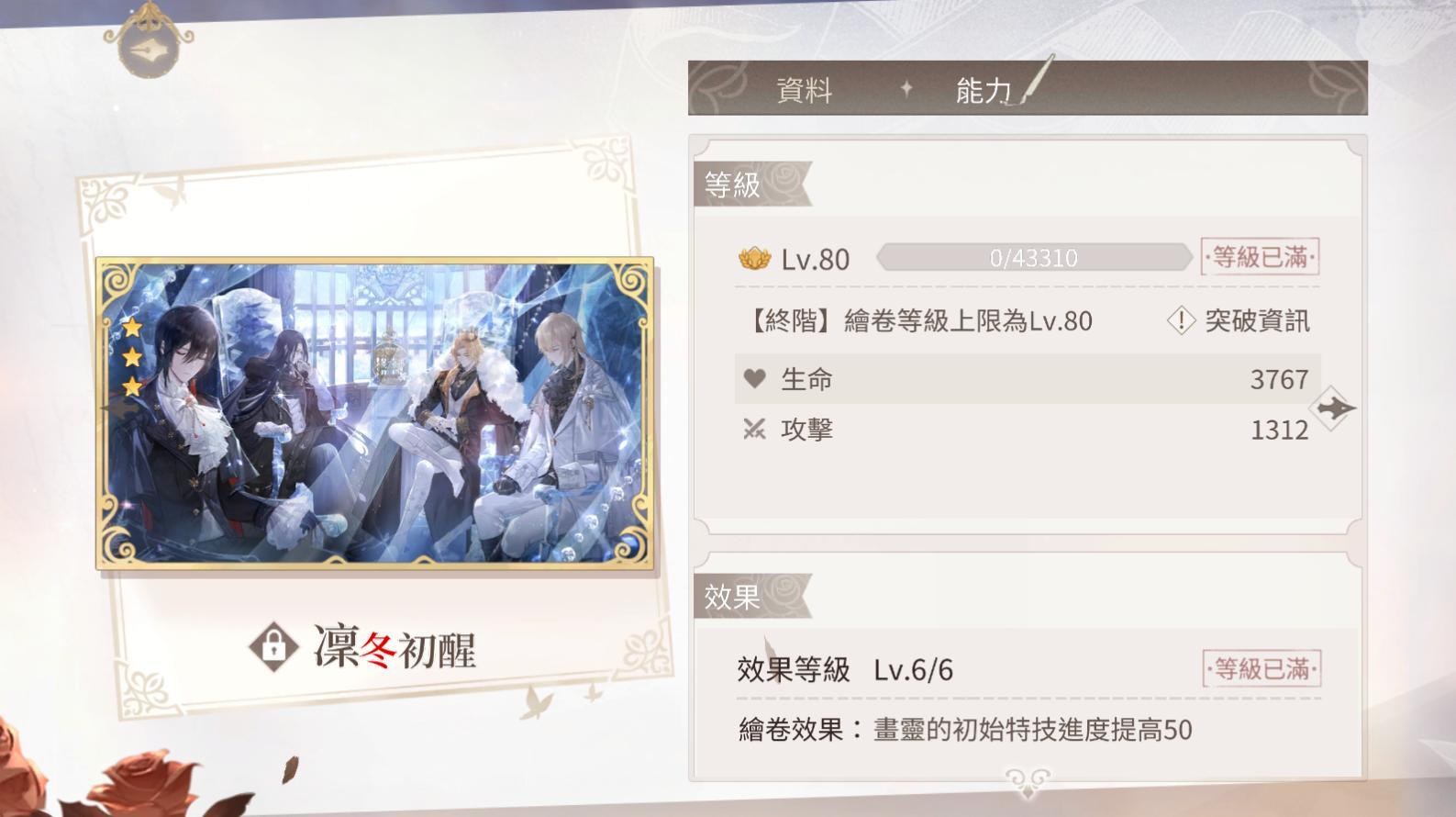 凜冬初醒是累儲繪卷,如果有幸拿到凜冬初醒,建議練起來,效果等級6比一般的繪卷特技進度提高多了一些