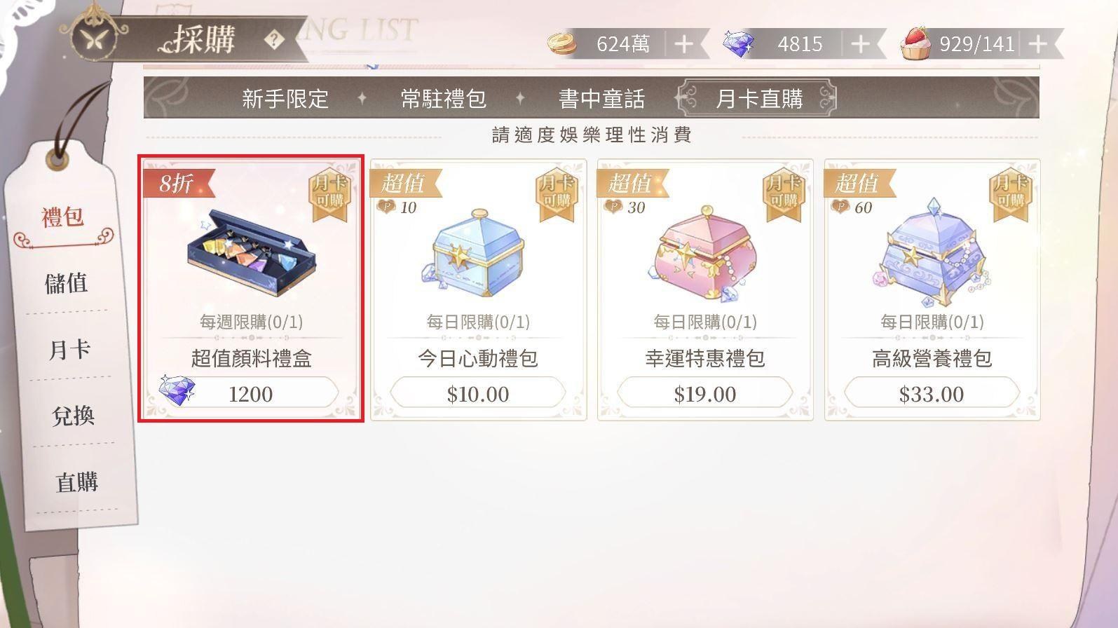 - 如果有購買月卡,每週可兌換8折的10個老荷蘭顏料(需要1200鑽石),