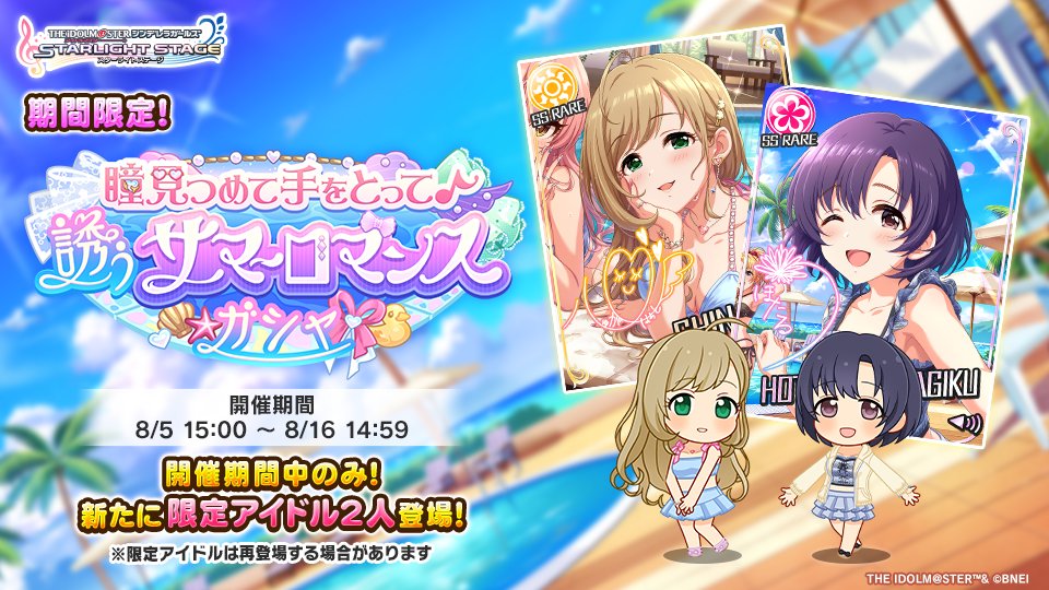 萬代南夢宮娛樂 旗下音樂遊戲《偶像大師灰姑娘女孩 星光舞台(アイドルマスター シンデレラガールズ スターライトステージ)》(iOS / Android),官方在今(5)日於推出期間限定轉蛋「瞳見つめて手をとって♪ 誘うサマーロマンス」。