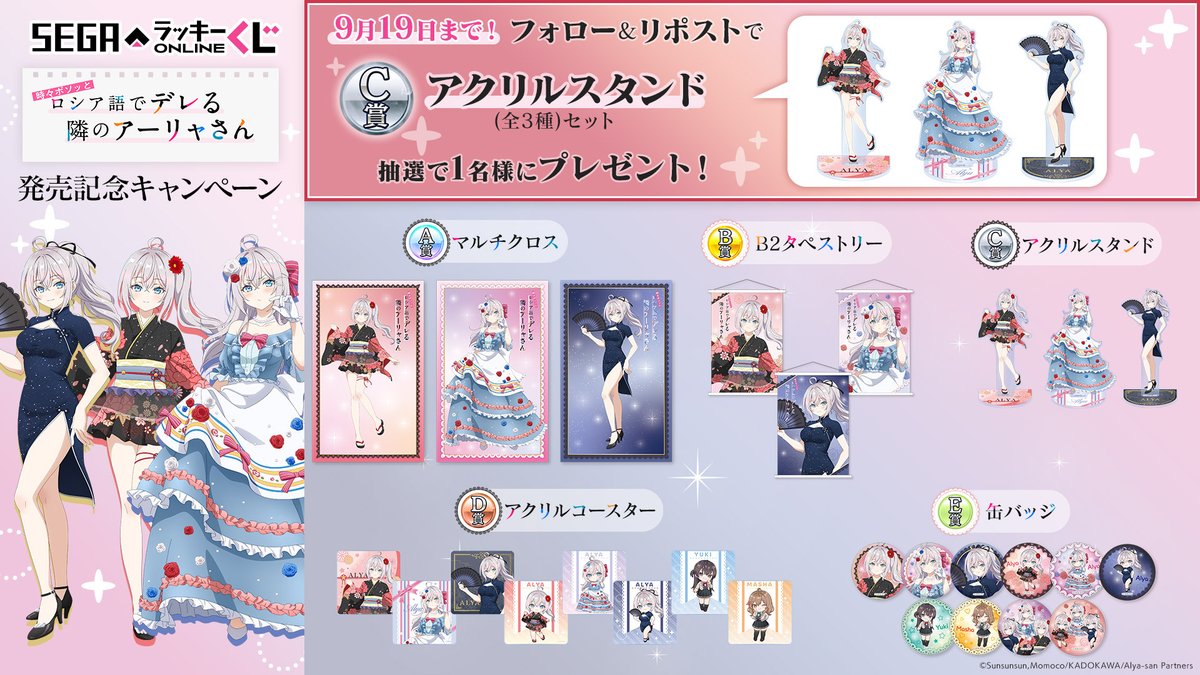 官方表示,期間內 8 月 20 日(五)~9 月 19 日(日)於線上抽獎平台「SEGA Lucky 線上一番賞」推出《不時輕聲地以俄語遮羞的鄰座艾莉同學》線上一番賞。獎項包含了 大尺寸視覺圖掛布、B2 掛軸、壓克力立牌、壓克力杯墊 以及 徽章等豪華獎品,獎項圖案是全新繪製。