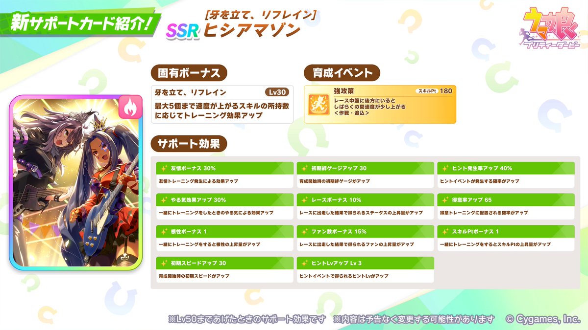 新支援卡池PU角色則為 SSR 成田白仁 [咆哮のアポヤンド]ナリタブライアン 以及 SSR 菱亞馬遜 [牙を立て、リフレイン]ヒシアマゾン 。