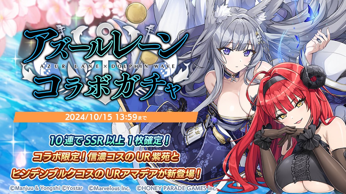 本次PU的新合作Cosplay海豚為 UR 住乃繪紫苑(信濃的衣裝) 住乃絵紫苑(信濃の衣装) 以及 UR 阿瑪迪婭・沃爾法(興登堡的衣裝) アマデア・ウォルファ(ヒンデンブルクの衣装) 。※本卡池新衣裝為期間限定