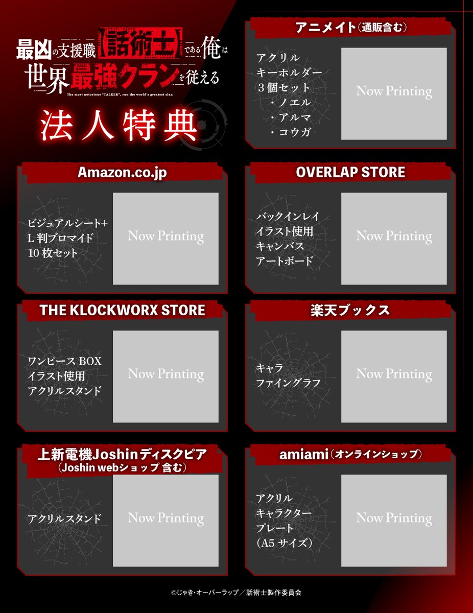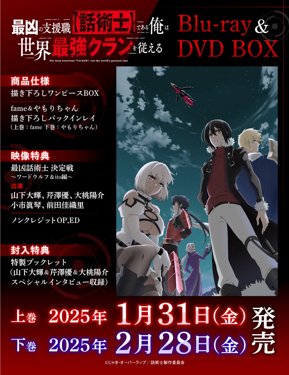 自 10 月 7 日起開播的電視動畫《最狂輔助職業【話術士】世界最強戰團聽我號令》將以 Blu-ray&DVD BOX 上下片的形式,分別於 2025 年 1 月 31 日以及 2 月 28 日發售,作為 法人別特典 共有 7 間店鋪並在日後公開特典插圖。