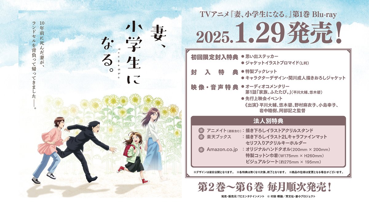 自 10 月 6 日開播的電視動畫《妻子變成小學生。》Blu-ray 將以全 6 片的形式發售,第 1 片率先將在 2025 年 1 月 29 日發售,作為法人別購入特典共有 3 家店舖並在日後公開特典插圖。