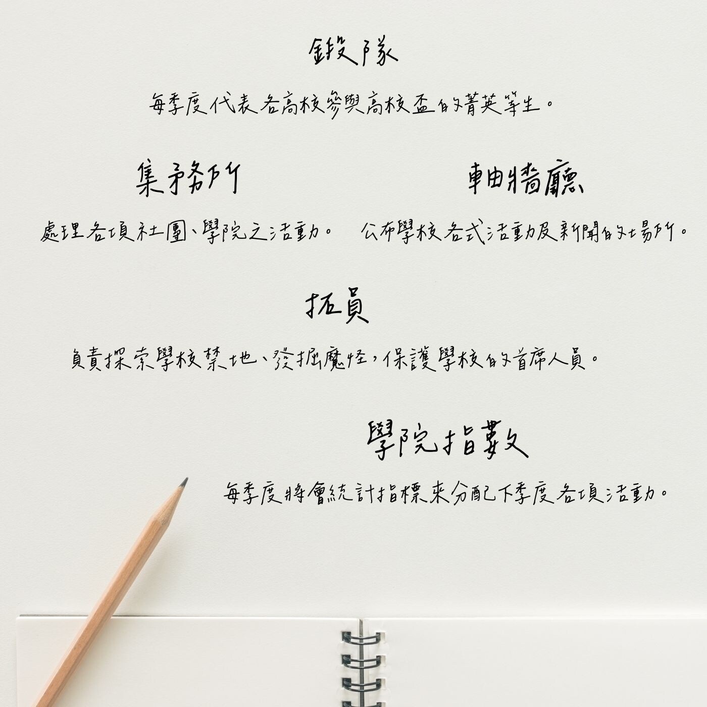 「現在由各學生長向各等生介紹本季度院內容。」