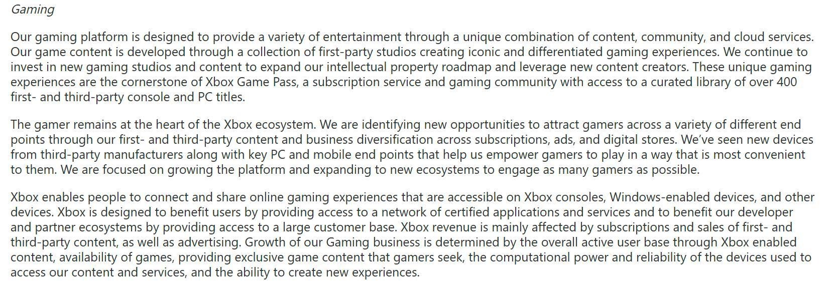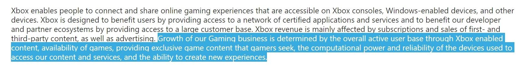 因為當我們深入地看微軟的年度報告,微軟用了三段去說關於遊戲業務方面的內容。