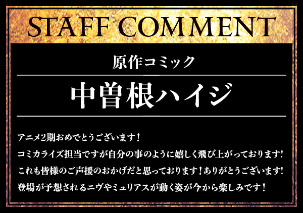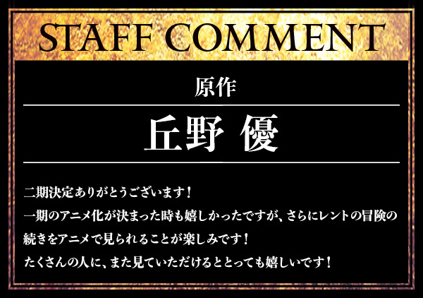 此外,為了慶祝動畫化,官方也釋出來自原作者.丘野 優、擔任小說插圖的 じゃいあん 以及漫畫版作者 中曽根ハイジ 等人的賀詞與賀圖。