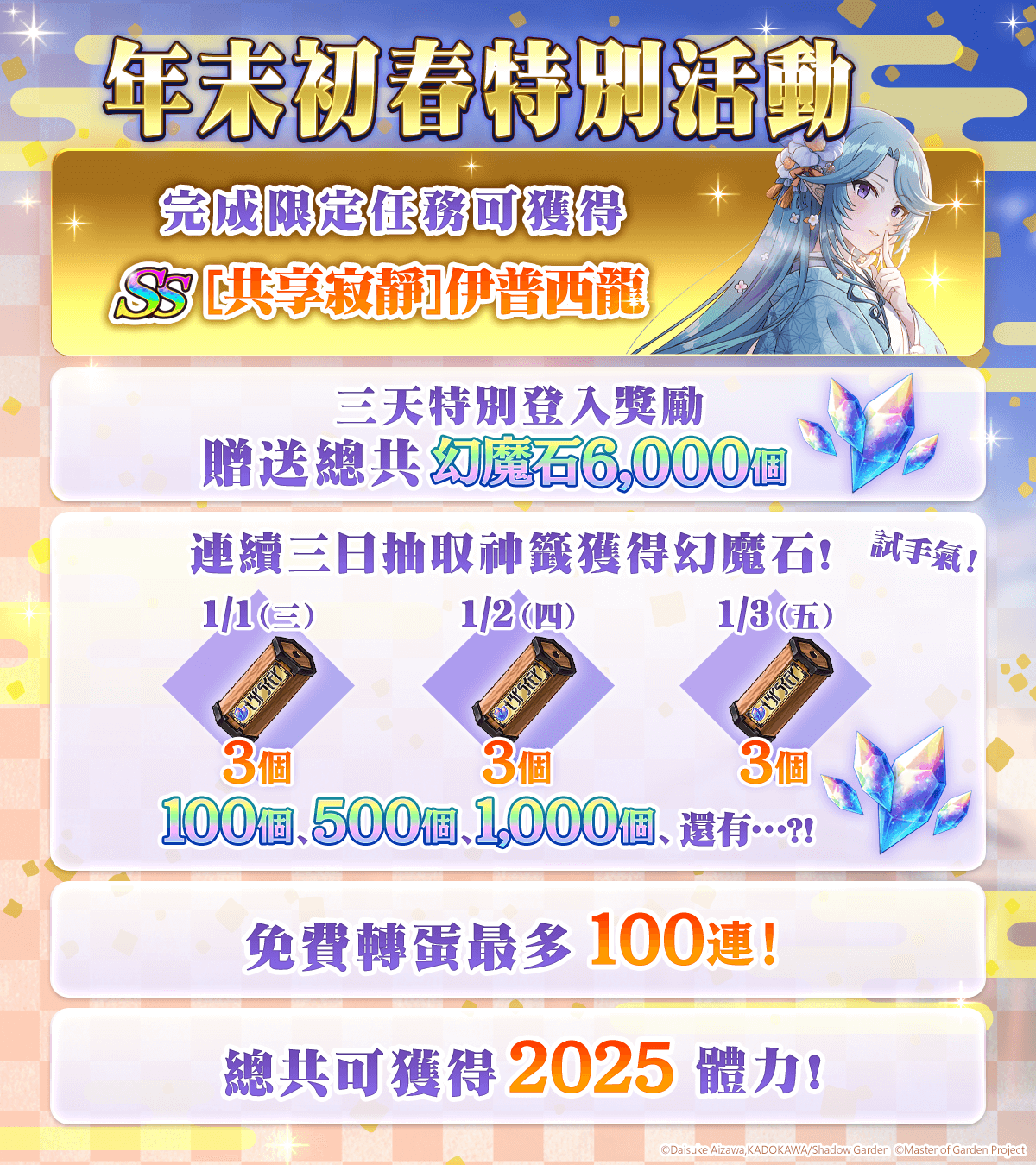 自 12 月 26 日起將實施「年末初春特別活動」,當中包含舉行可獲得【共享寂靜】伊普西龍.保證獲得 SS 角色轉蛋券 1 張等諸多豪華獎勵的 年末初春限定任務、可獲得合計 6,000 個幻魔石的 三天特別登入獎勵、可獲得 9 個「神籤道具箱」並有機率開出幻魔石 10,000 個的 抽取神籤特別活動、可獲得總計 2025 體力的 贈送體力活動、培育支援活動 以及販售【新年限定漢堡增量】毎月特惠幻魔石。