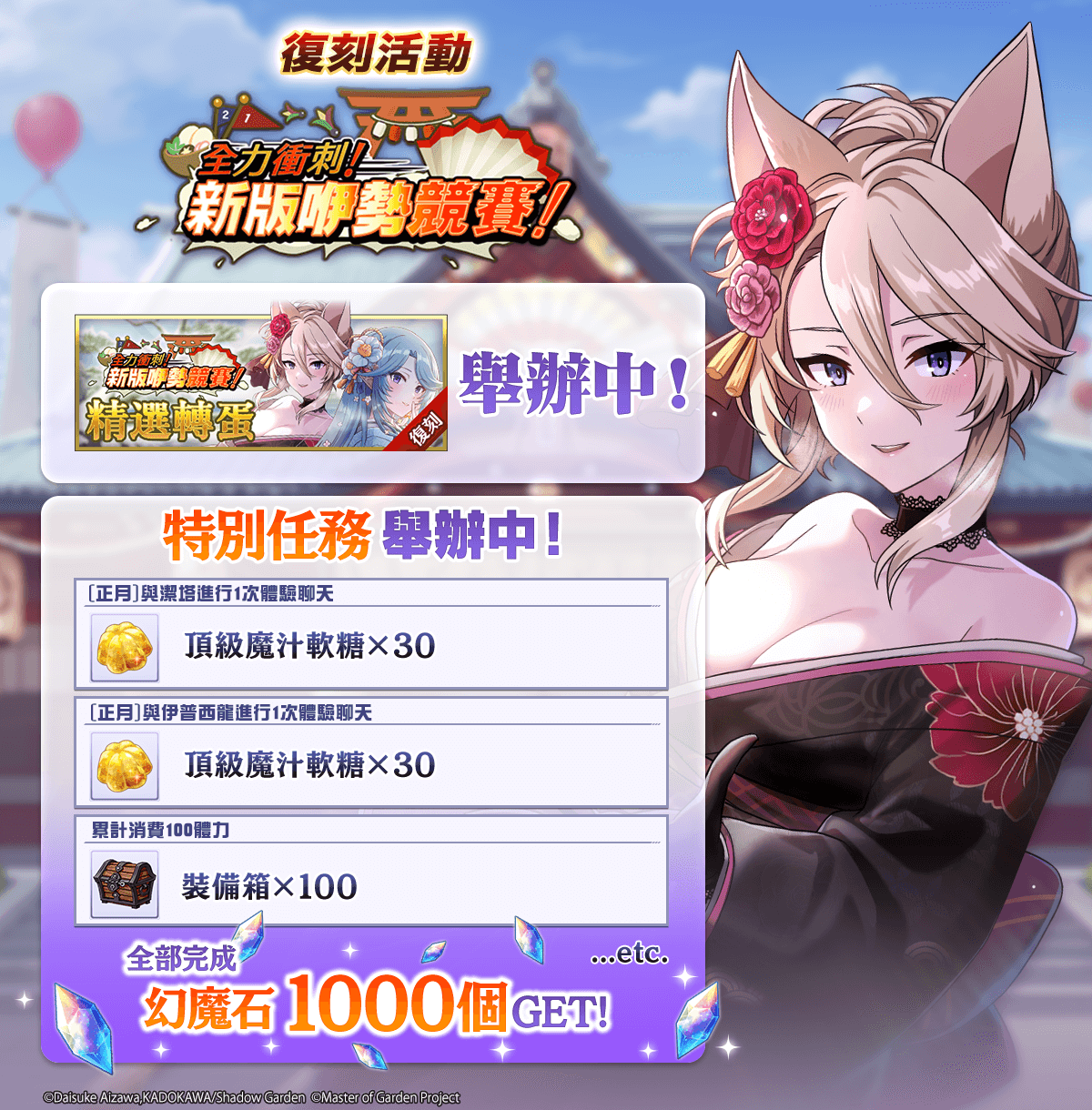 為紀念期間限定活動『特別任務!我想吃最高級的年菜』舉行,期間內登入遊戲可獲得 1,500 幻魔石與各種素材。