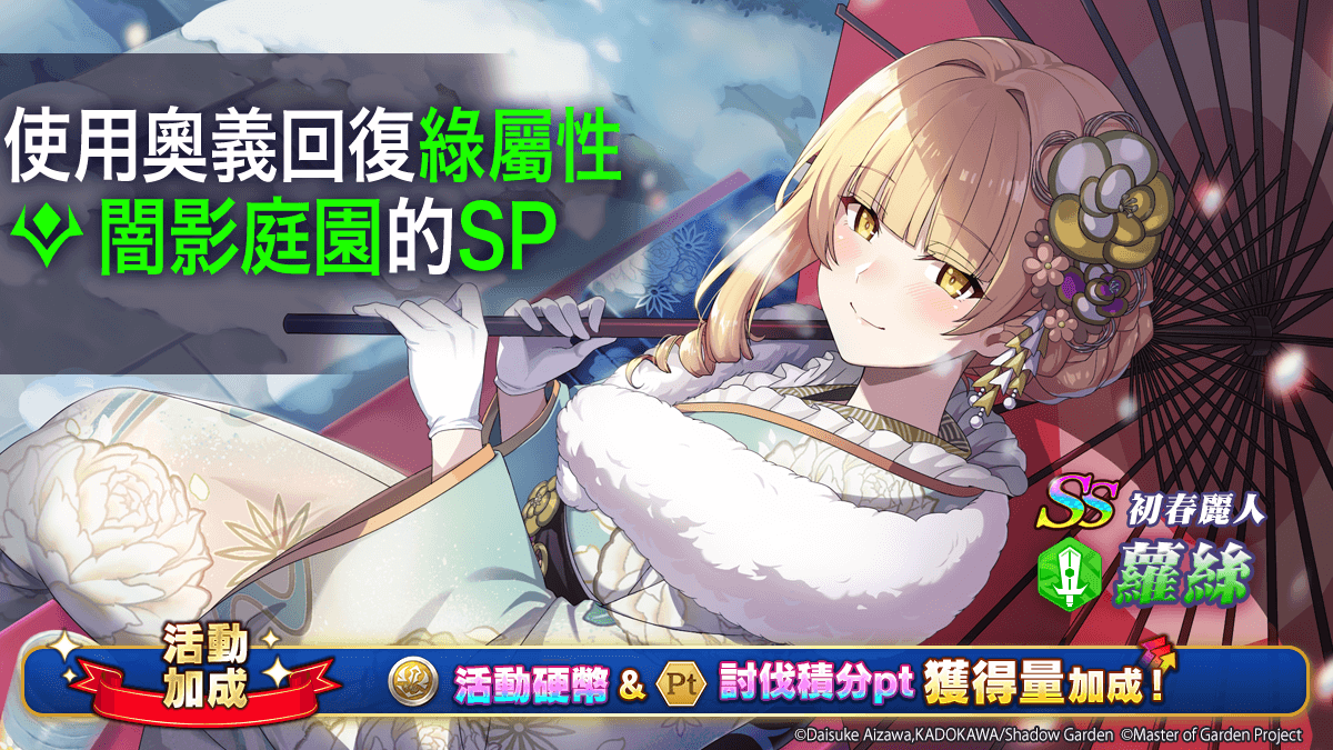 伴隨期間限定活動『特別任務!我想吃最高級的年菜』舉行,自 12 月 26 日率先登場的期間限定轉蛋卡池角色【初春麗人】蘿絲,是名使用奧義回復綠屬性暗影庭園 SP 的綠色屬性輸出角色,日後則會實裝【迎春は可憐に】維多莉亞。