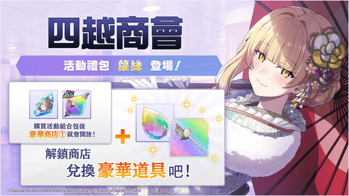 於四越商會內新增活動禮包【初春麗人】蘿絲,內容包含了 角色碎片、玉白祝福之劍魔道具 等道具。