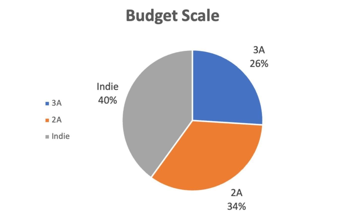 Anyway,2022年的資料我們可以看見當年,獨立遊戲的比例是40%,2A級別的作品是34%,3A級別的作品是26%,所以2024年其實2A級別作品是多了。