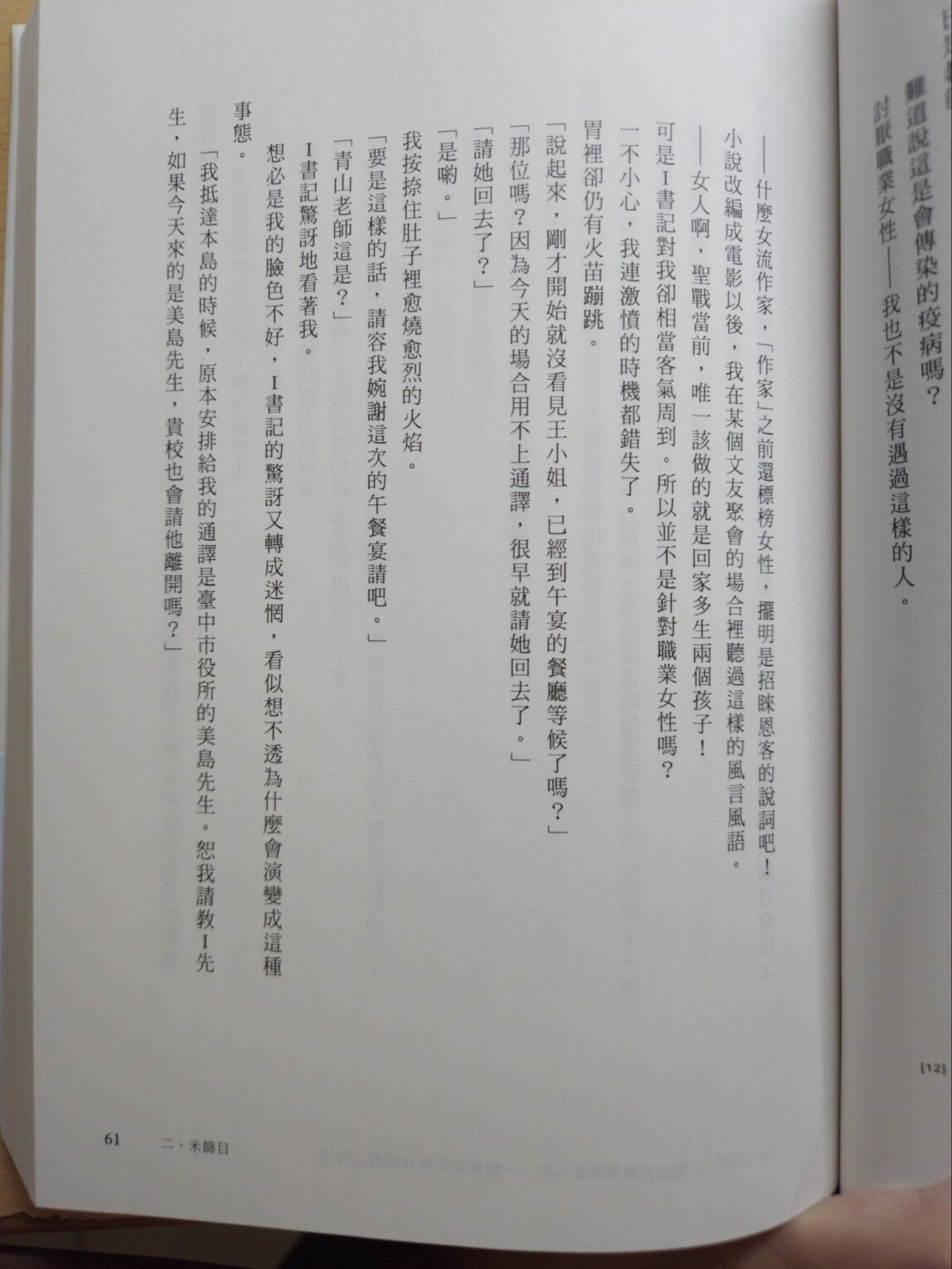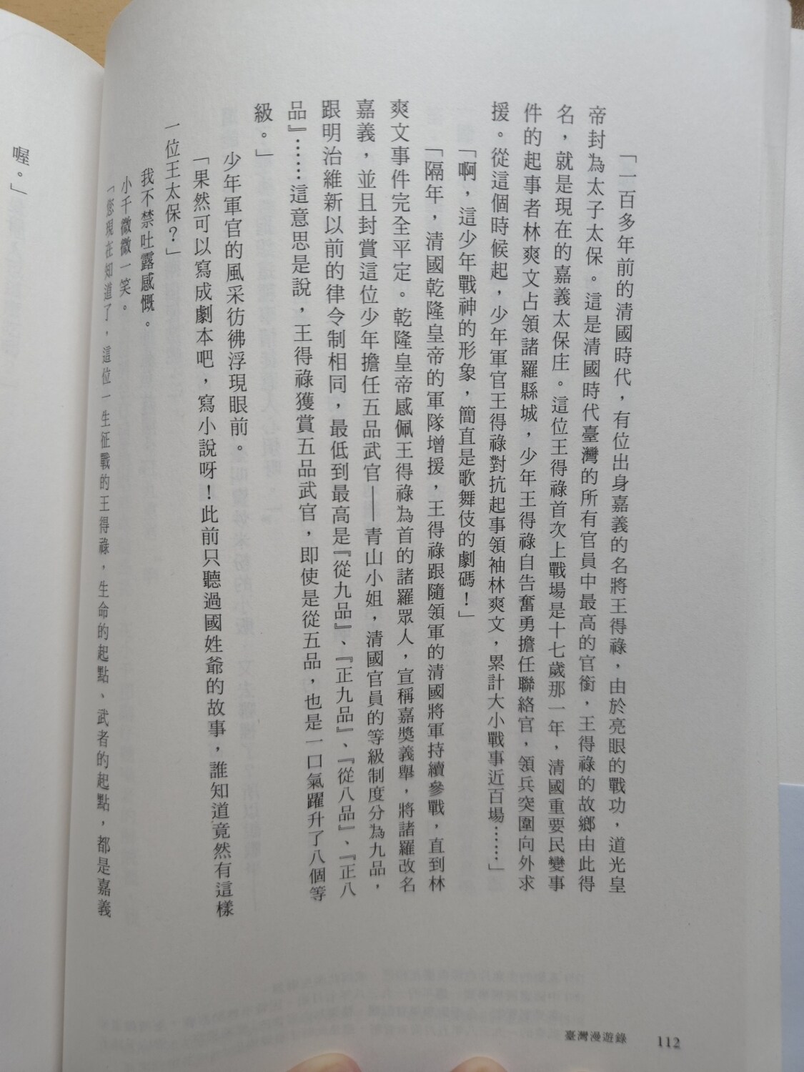 之前上課讀過其中的一篇,嘉義的〈生魚片〉,對這書的印象不是很好。比起小說,根本是遊客中心的旅遊手冊。最近《臺灣漫遊錄》得了美國國家圖書獎,就想說只讀一章會有偏見,到書店買下這本書。開頭是有驚豔我的,「內地」、「支那」等用詞很有年代味,但隨著閱讀進度到第二章、第三章,耐心是越來越少了,源自於根本上寫作功力的不足。