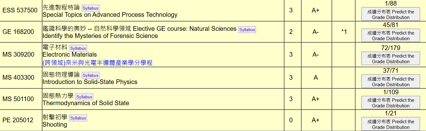 心得:課程中部分內容與電子材料和量物導論有所重疊,對修過這兩門課的人而言應該還算輕鬆。雖然課程內容包含大量推導,但教授比較重視你能不能明白推倒結果與現象的結合,能夠搞懂公式/原理與圖片間的連結算是這門課的重點。如果覺得講義看不懂,可以考慮直接翻課本讀。另外,考試的時候是開書考,可以帶紙本資料。