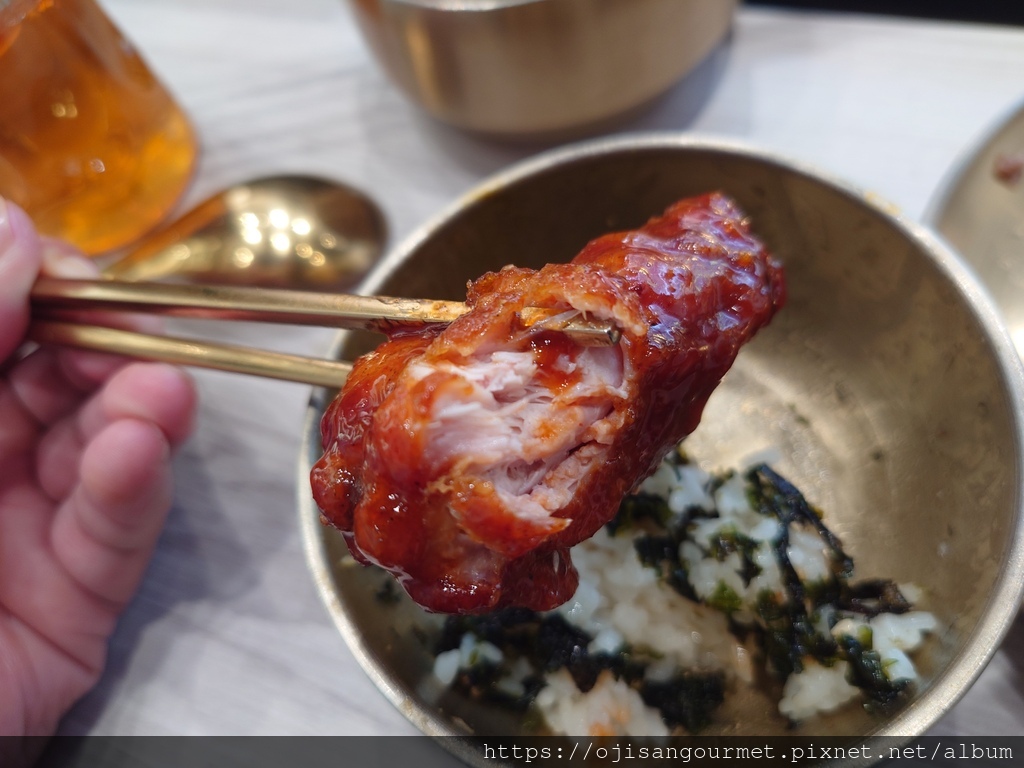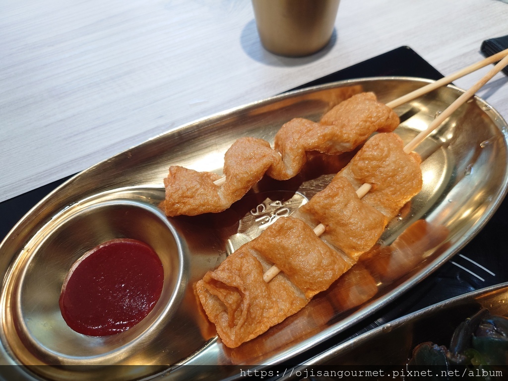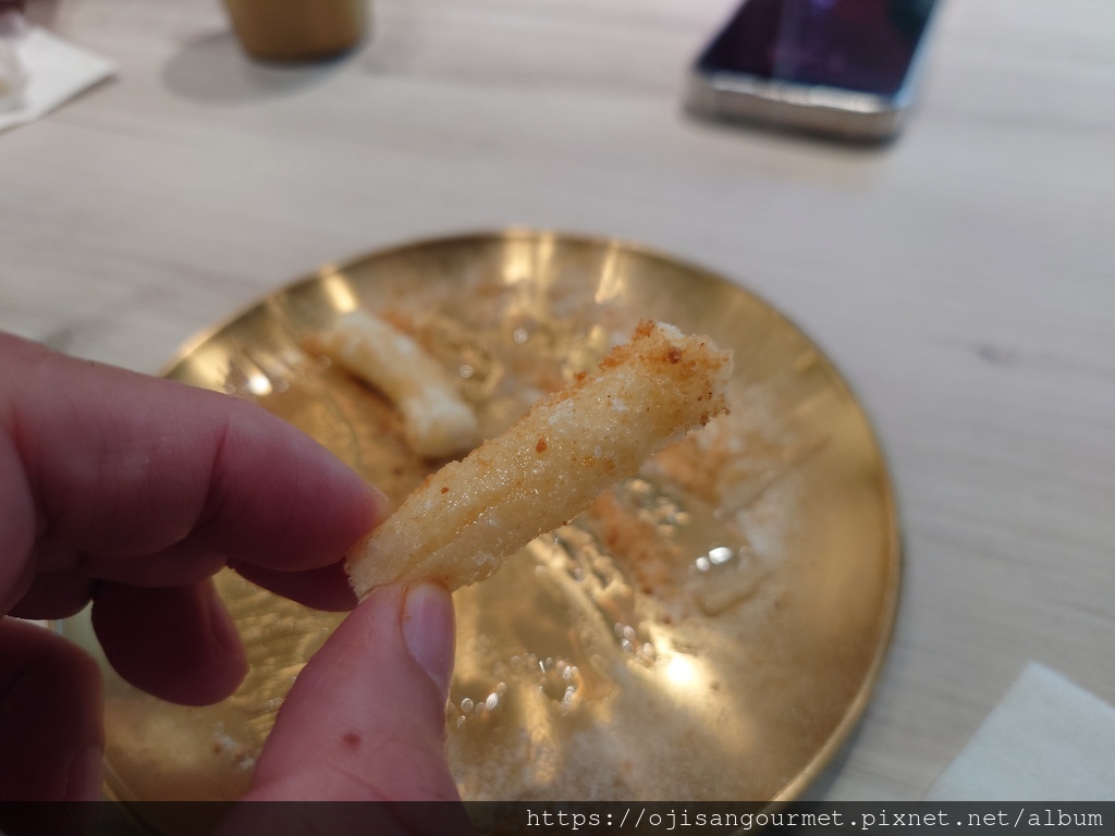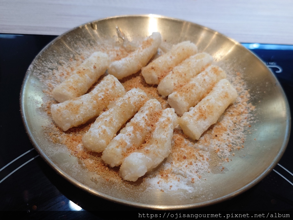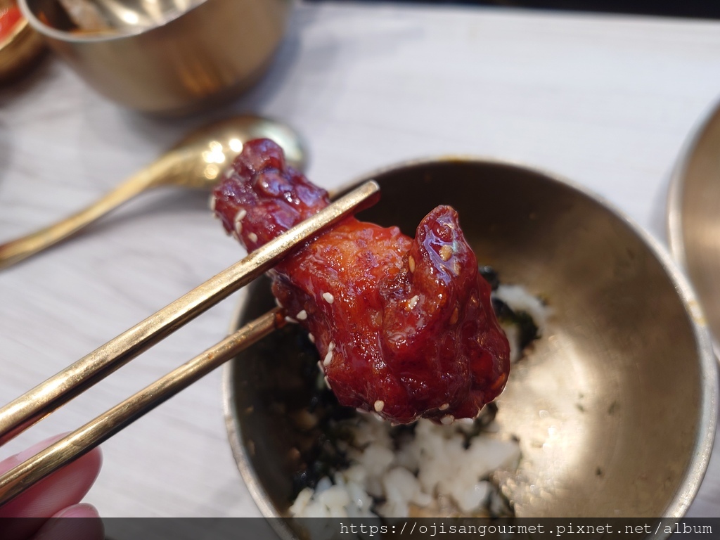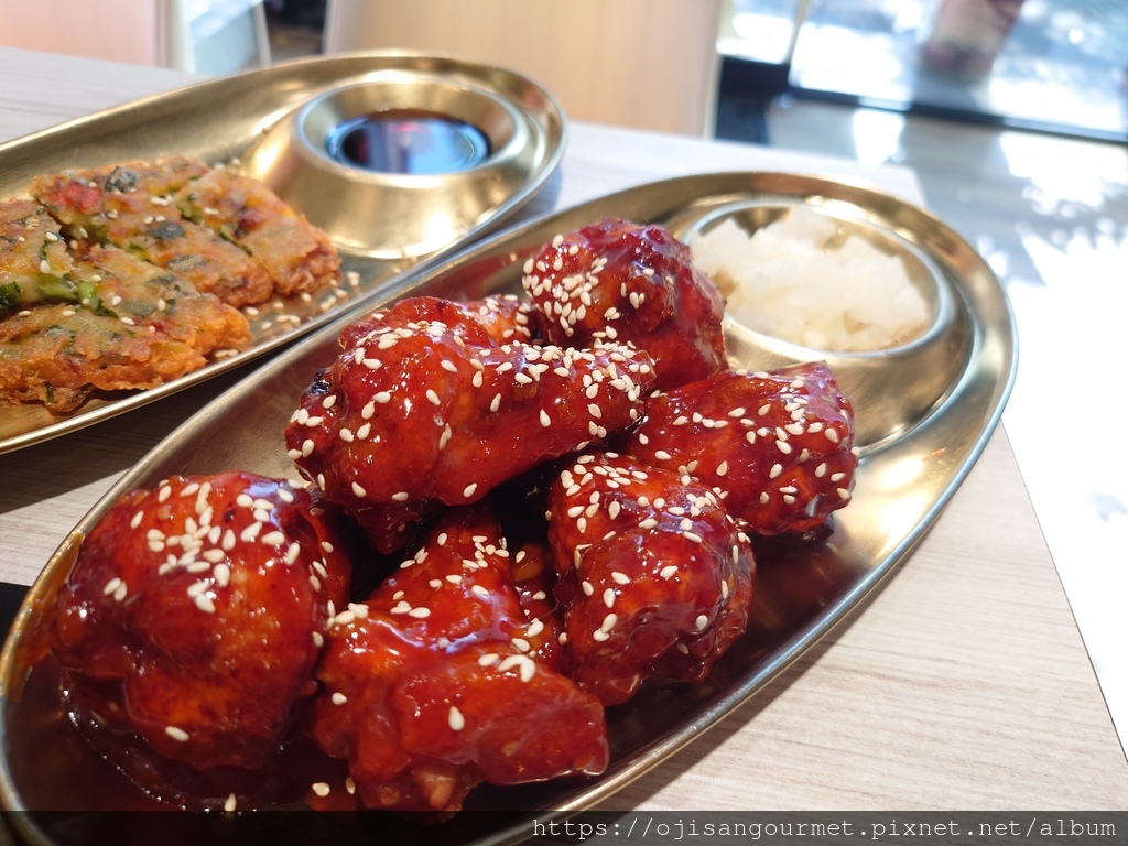 雙人套餐還有兩串魚板、蔬菜煎餅、韓式炸雞以及飯後甜點的炸年糕--炸過的魚板外層酥脆,和韓式醬非常對味;蔬菜煎餅可以說是海鮮煎餅的精簡版,【正谷家】的煎餅脆度甚至優於炸魚板,適合風味比較清淡的醬油;韓式炸雞是另一個亮點,我們選擇微辣,事後證明是正確的決定,對於喜歡喝啤酒的食客,這是最佳搭檔;此外,向來都是吃醬炒,今天還是第一次吃炸韓式年糕,搭配花生粉做成甜食百吃不膩。如果怕澱粉不夠,還有一石鍋的海苔拌飯,我們吃得非常飽足。