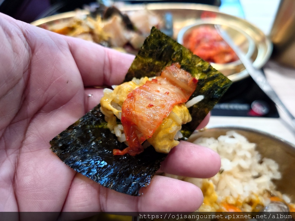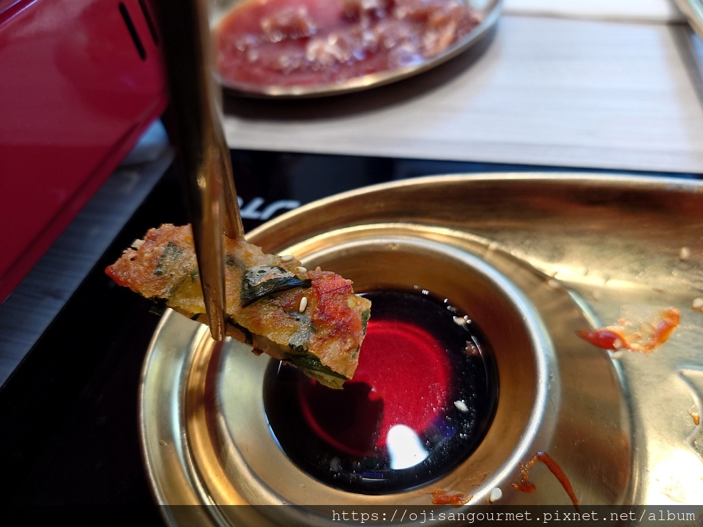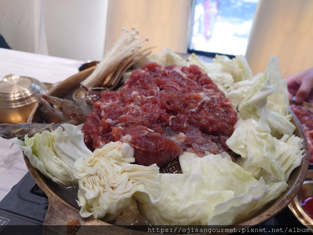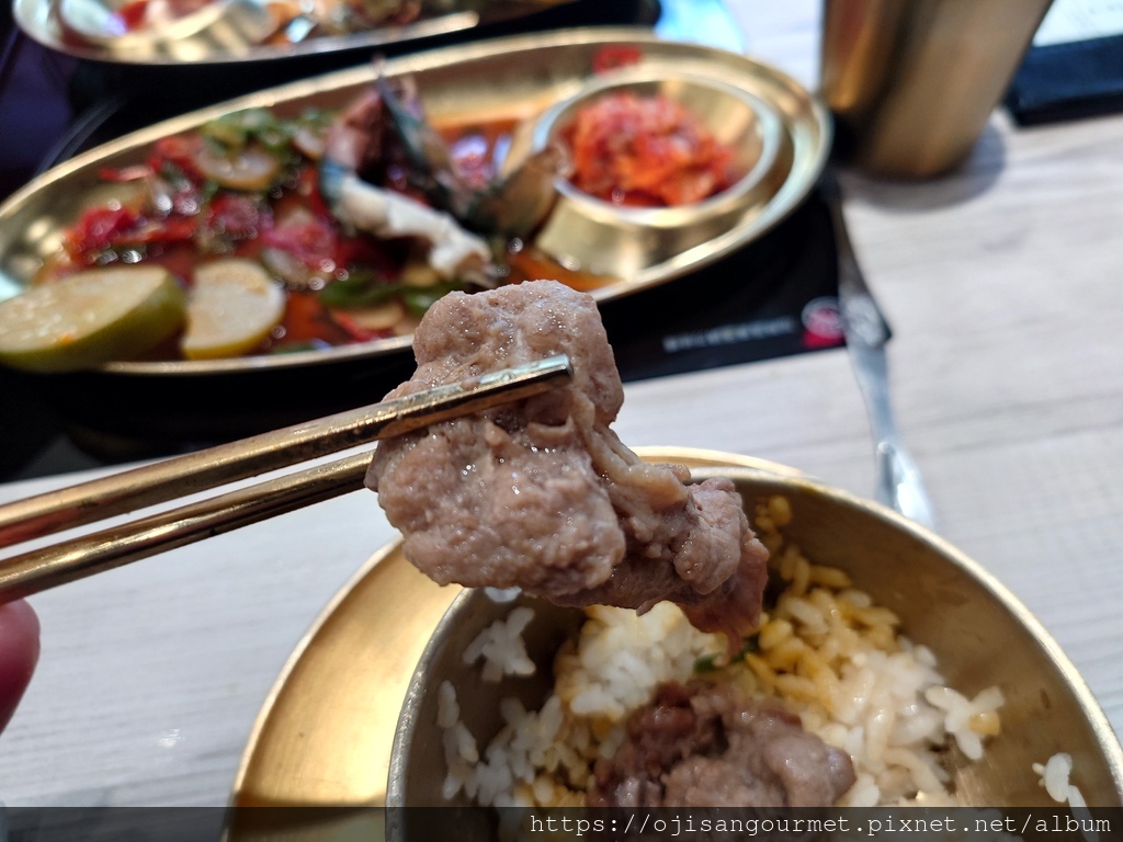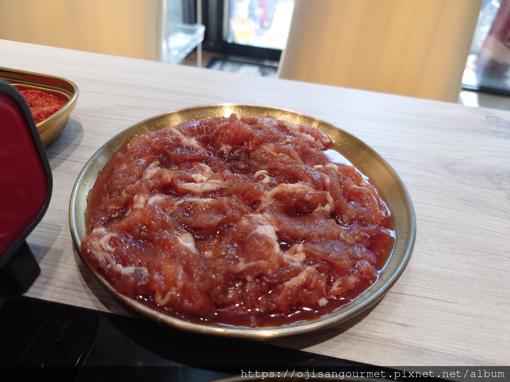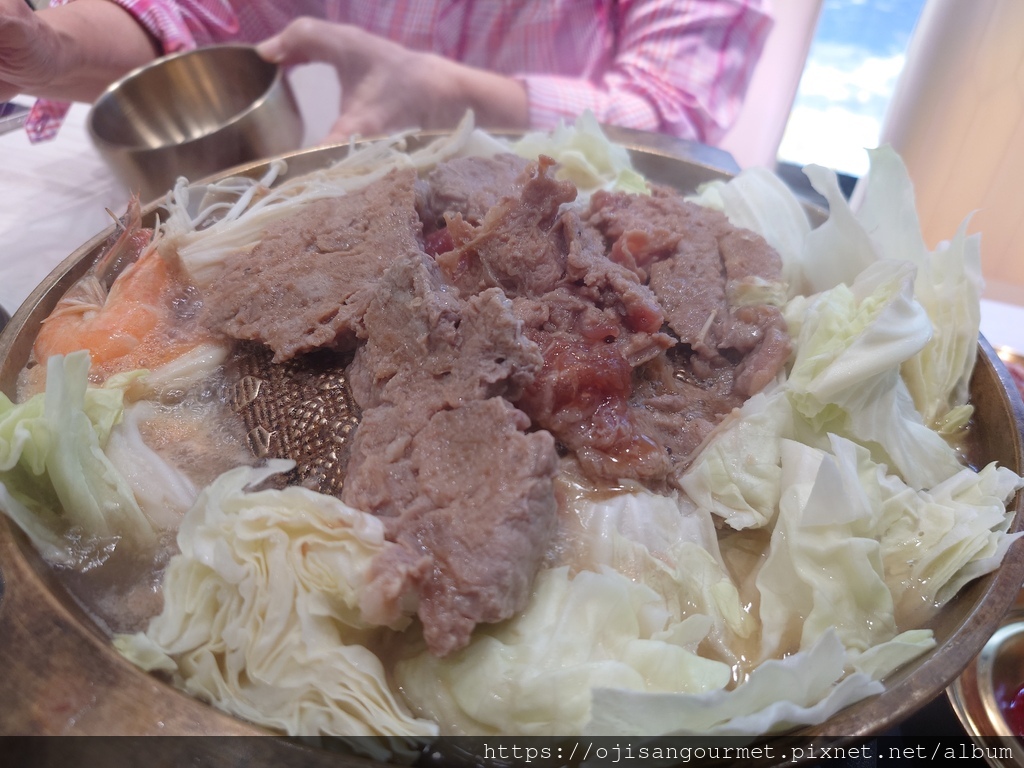 至於「銅盤烤肉」是傳統的醬料醃肉搭配一圈高麗菜,手切的肉片有厚度,外型也稍微不規則。烤到全熟後入口,很開心地發現肉質柔軟,醬汁風味偏甜不膩,搭配已經完全煮軟的高麗菜,兩種不同的甜在口腔內交織,即使還追加了一份肉,當吃下最後一片時依然感到依依不捨。