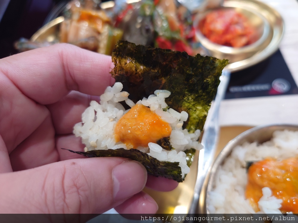 雖然看起來猶如剛挖開新鮮,其實蟹黃蟹膏已經被醃得完全入味,鹹香鮮帶著似有若無的酸,和麻油海苔的香氣以及白飯融合得完美無缺。若是用更多的麻油海苔香包覆,風味更佳提升,不敢吃生醃蟹的兩位女賓可惜了,大叔快樂地獨吞,接著以蟹夾和硬殼奮戰。餐後長官雖然沒吃這一品,還是特地向服務生美眉確認,店家所使用的螃蟹(應該是紅蟳)都是 made in Taiwan,除了減少碳足跡,安全上也更有保障。