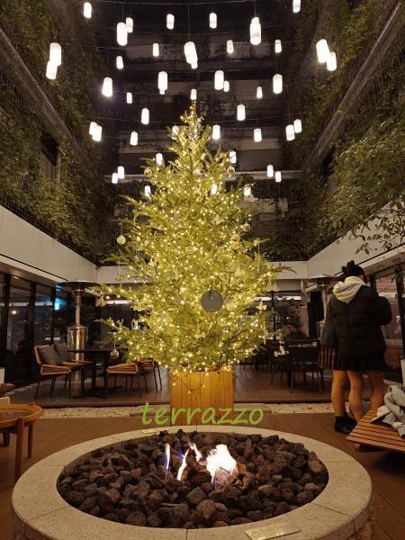 夜色下的飯店露天庭院,除了點了燈,還有讓人取暖的火爐