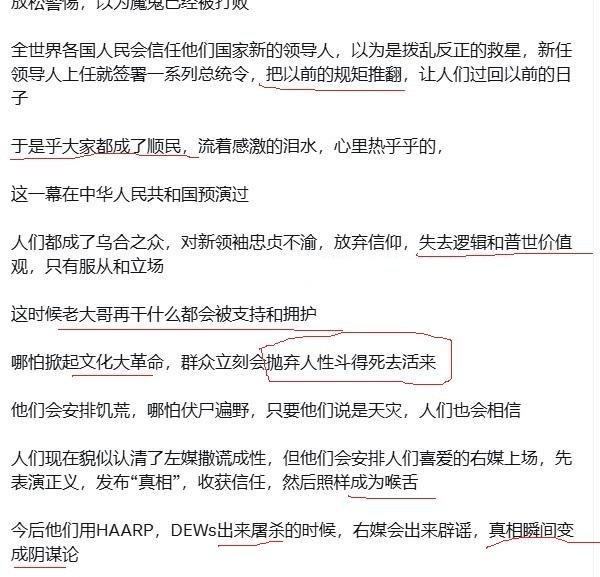 你也可以反向思考一下,如果這群人真的那麼有本事,什麼都看得穿,什麼講得都是真的,為什麼不是為了改善世界提供可行的解決辦法,而是使勁的散播恐懼、散播絕望,然後不斷告訴你同一個答案"不管你們任何人想什麼做甚麼都沒用,世界將永遠被惡者支配,絕望吧,乖乖被統治吧"