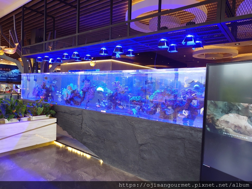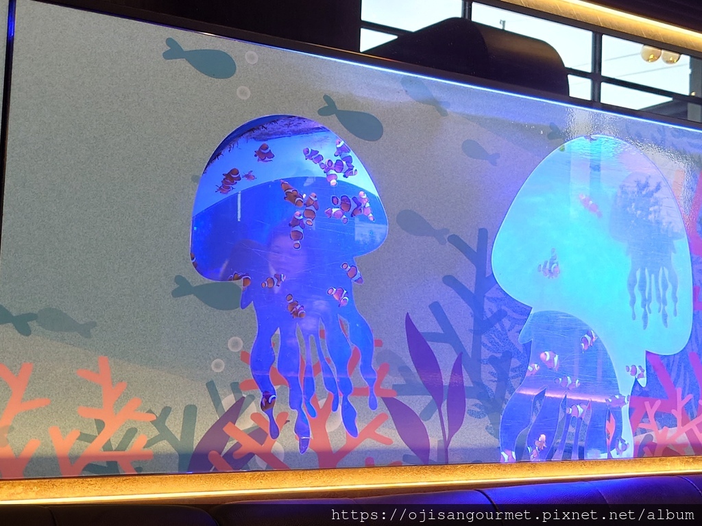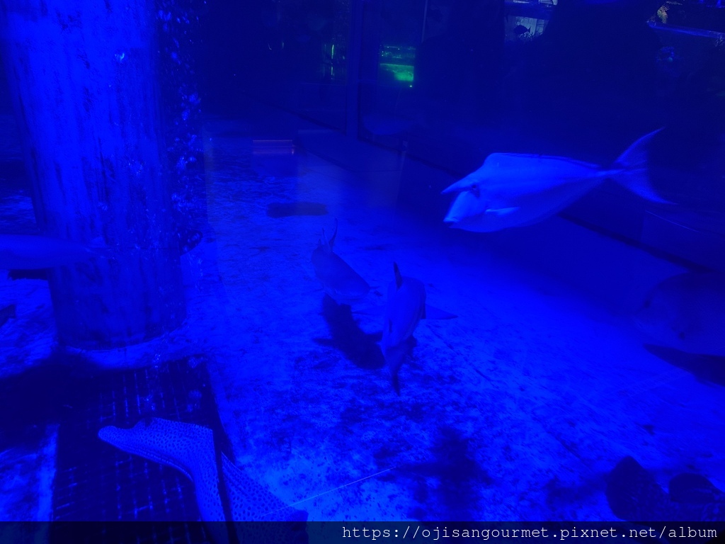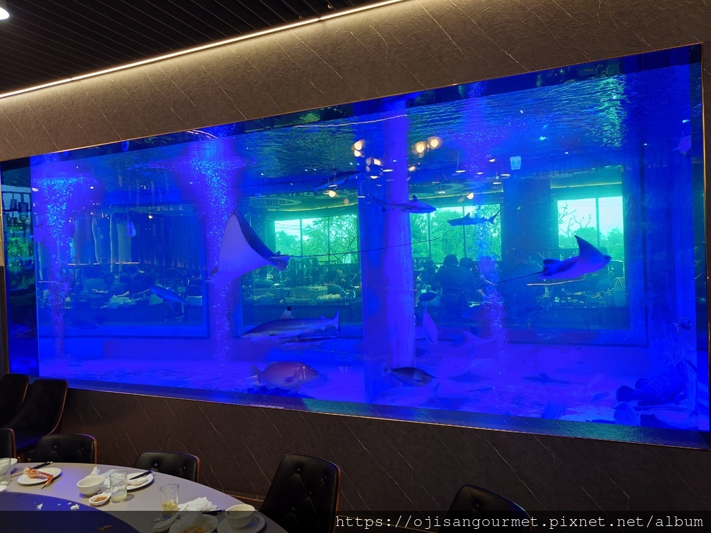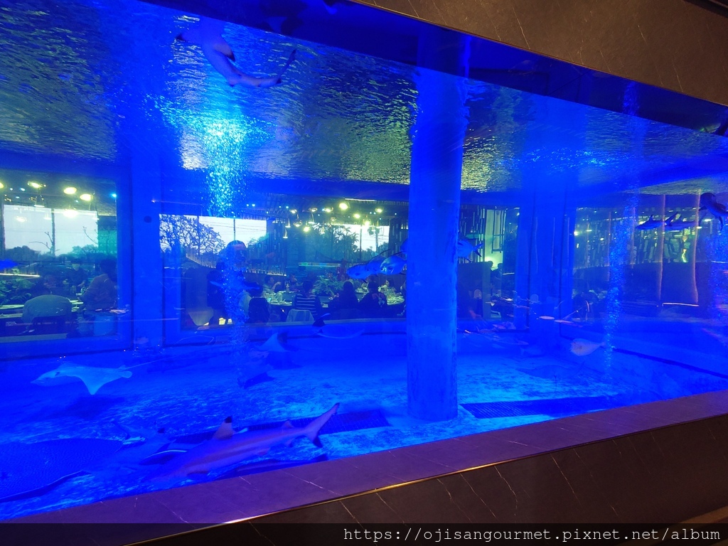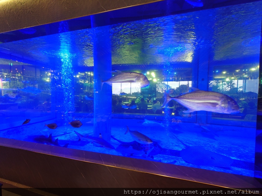 一踏進餐廳,映入眼簾的除了數十個位於桌位旁,海馬和小丑魚等悠游其中的水族箱,還有位於餐廳正中央,吸引許多來客拍照打卡熱點--有魟魚、鯊魚、牛港、剝皮魚、薯鰻……等等,媲美公眾水族館的大號玻璃缸。在蔚藍的光照下,恍如真實海底世界,光注視其中就很療癒,絕對不是在評估魚類的可食性。