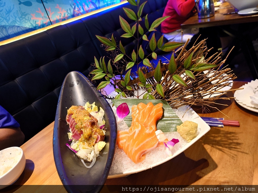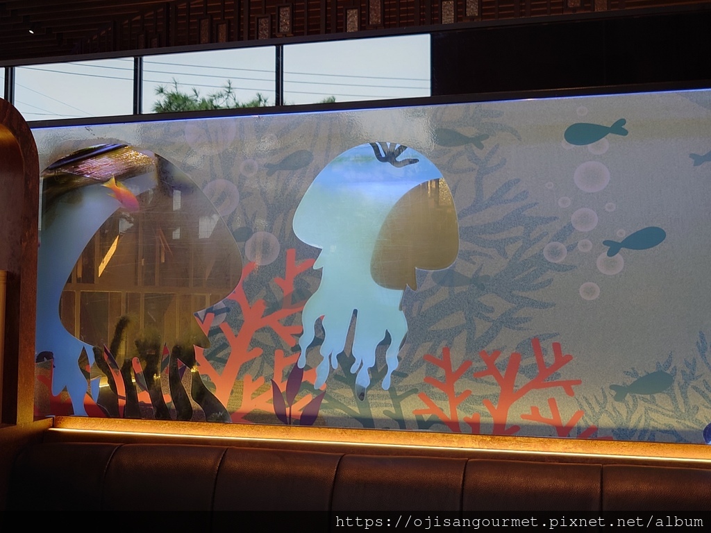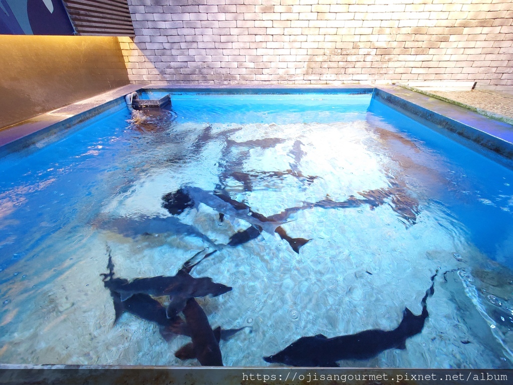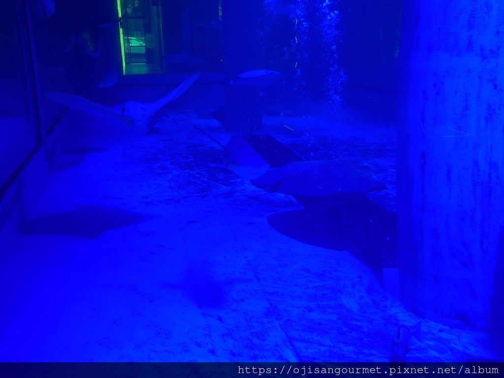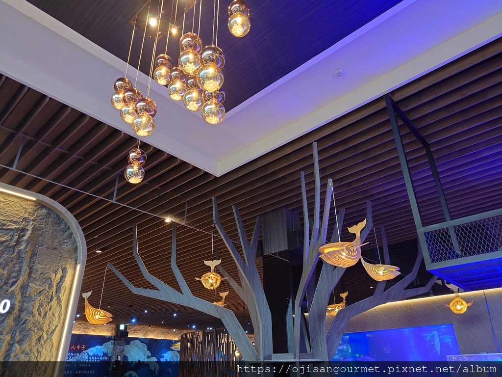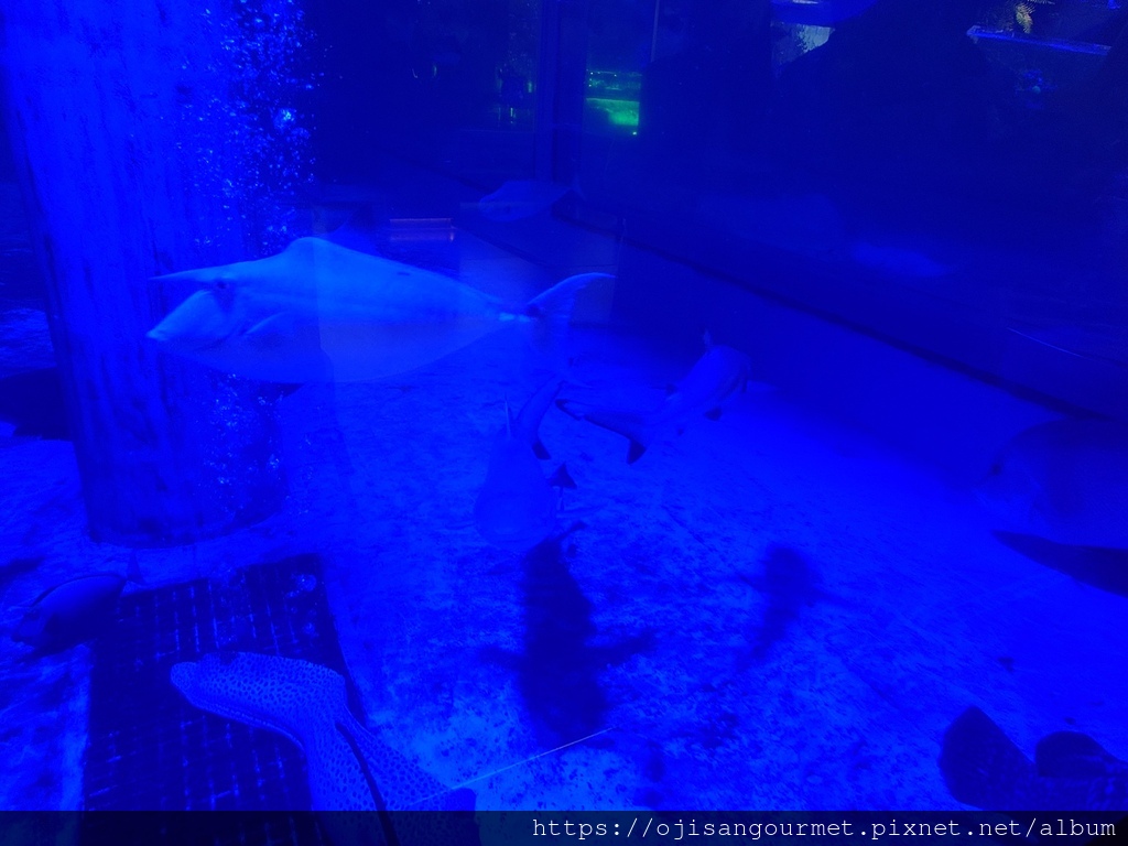 一踏進餐廳,映入眼簾的除了數十個位於桌位旁,海馬和小丑魚等悠游其中的水族箱,還有位於餐廳正中央,吸引許多來客拍照打卡熱點--有魟魚、鯊魚、牛港、剝皮魚、薯鰻……等等,媲美公眾水族館的大號玻璃缸。在蔚藍的光照下,恍如真實海底世界,光注視其中就很療癒,絕對不是在評估魚類的可食性。